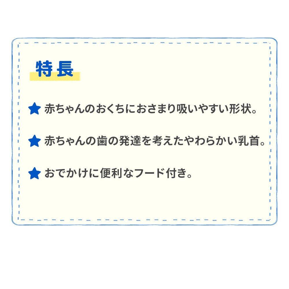 お口にフィットし落ち着きをサポート。歯の発達を考えたやわらか乳首。歯の発達に影響が少ないように配慮した やわらかいシリコーンゴム製。舌が動いている時でも おくちの中で安定する形状。赤ちゃんが唇で保持しやすい幅。