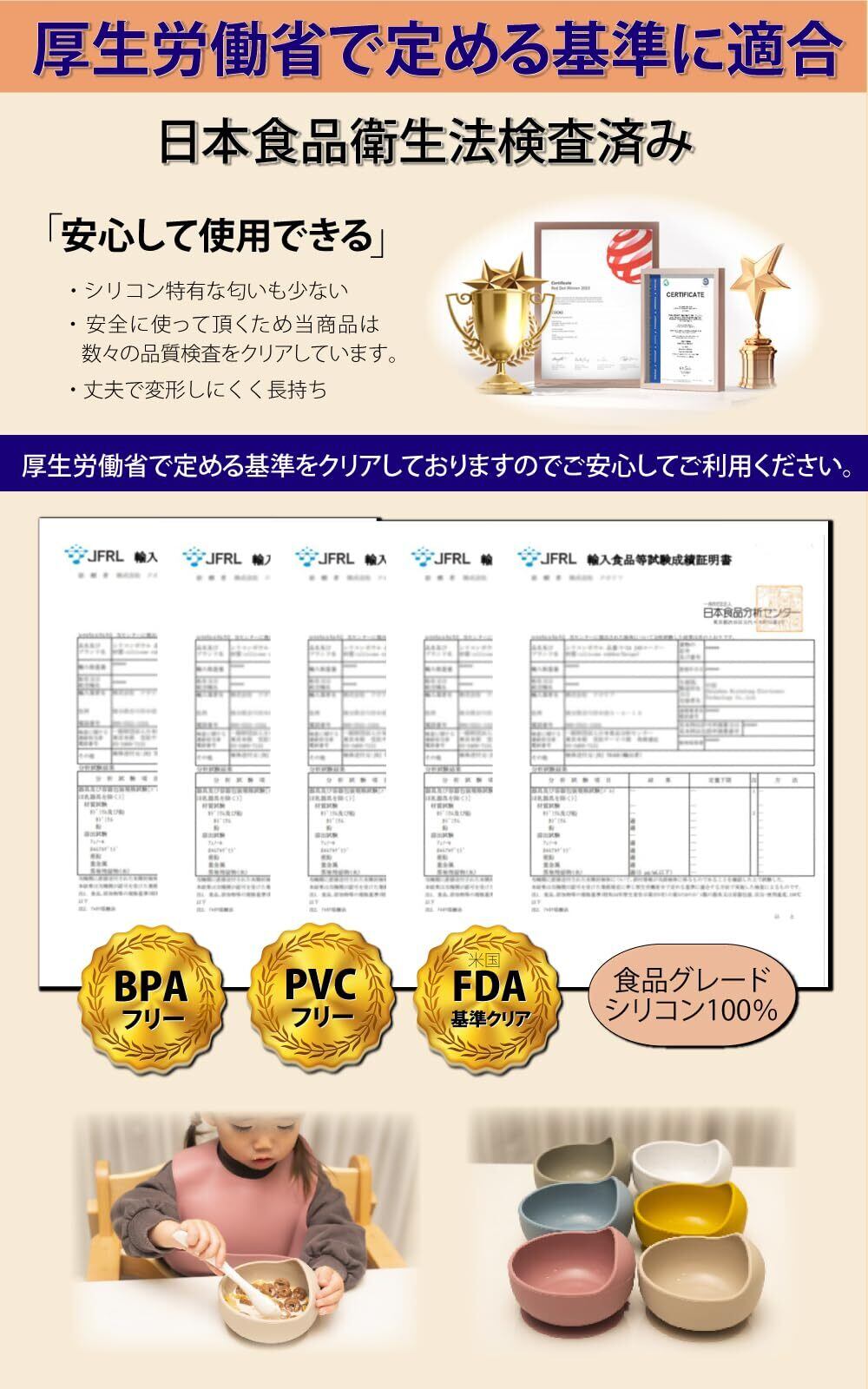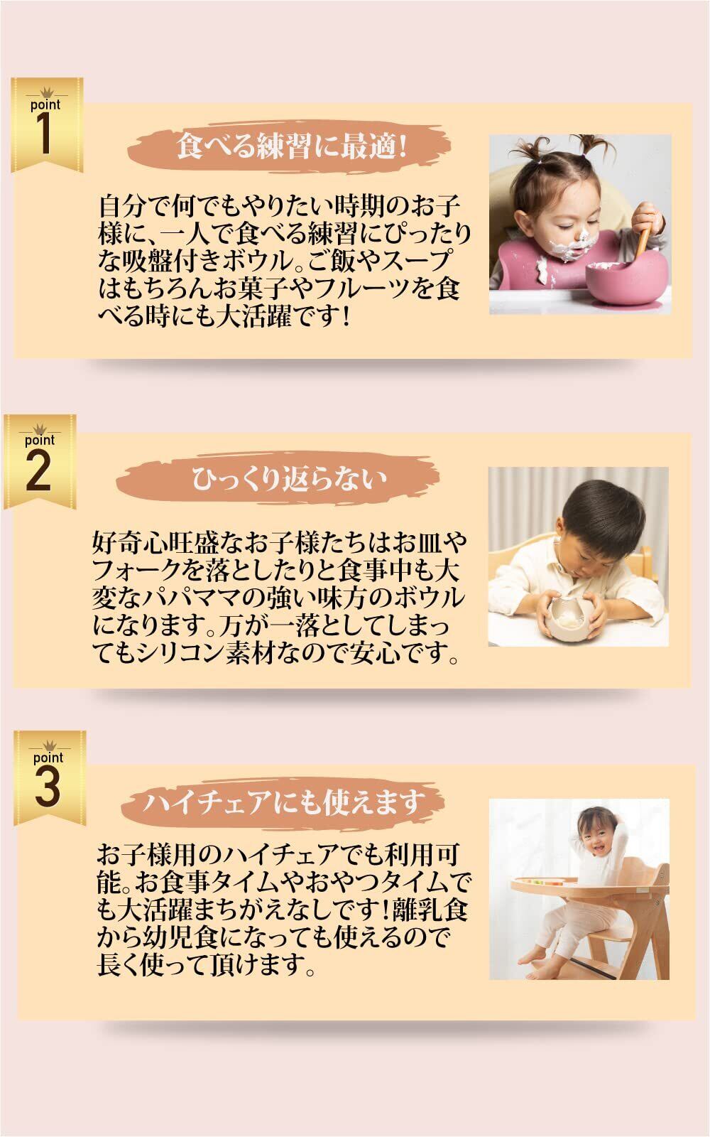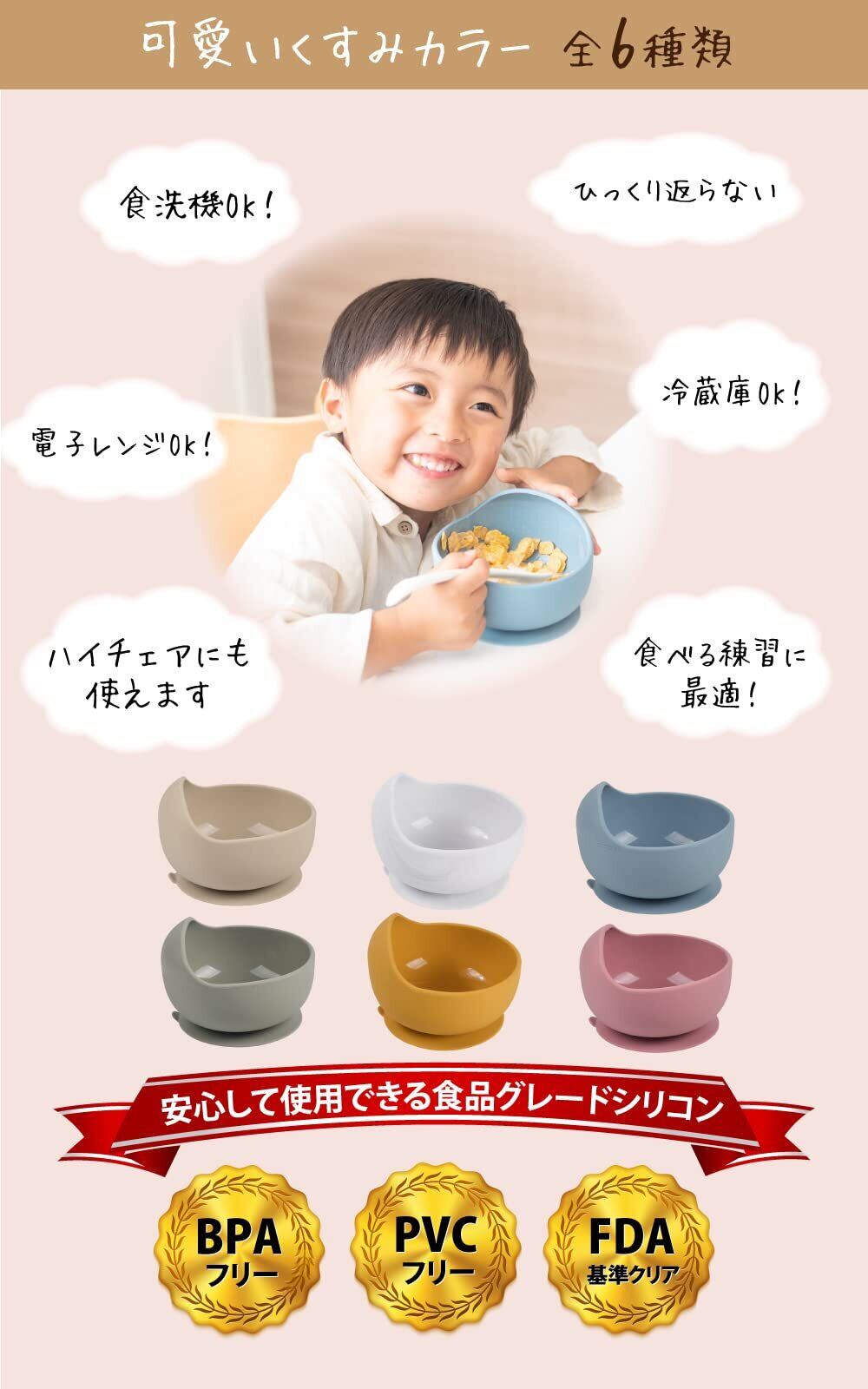 ・お食事中に食器をひっくり返してしまうことや落として割ってしまう心配がない、安心・安全な吸盤付きのシリコン製ボウル。
