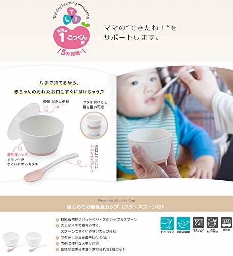 メモリ付きのすくいやすい小さめ離乳食カップ、保管・加熱に便利なフタ、お口にやさしいやわらかスプーンの2組セット