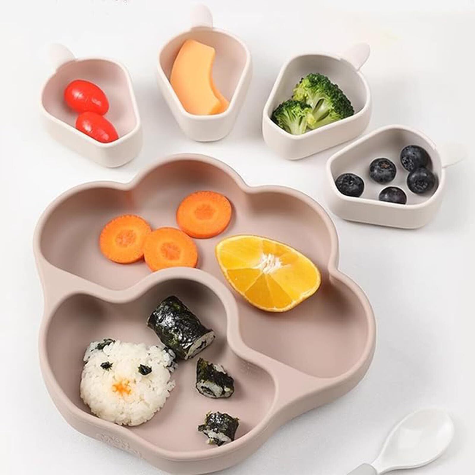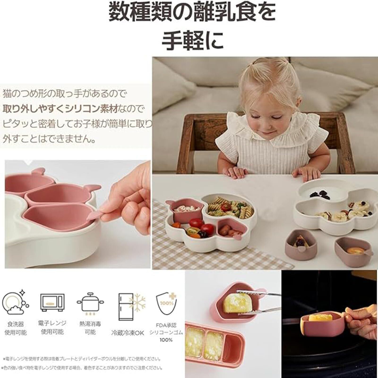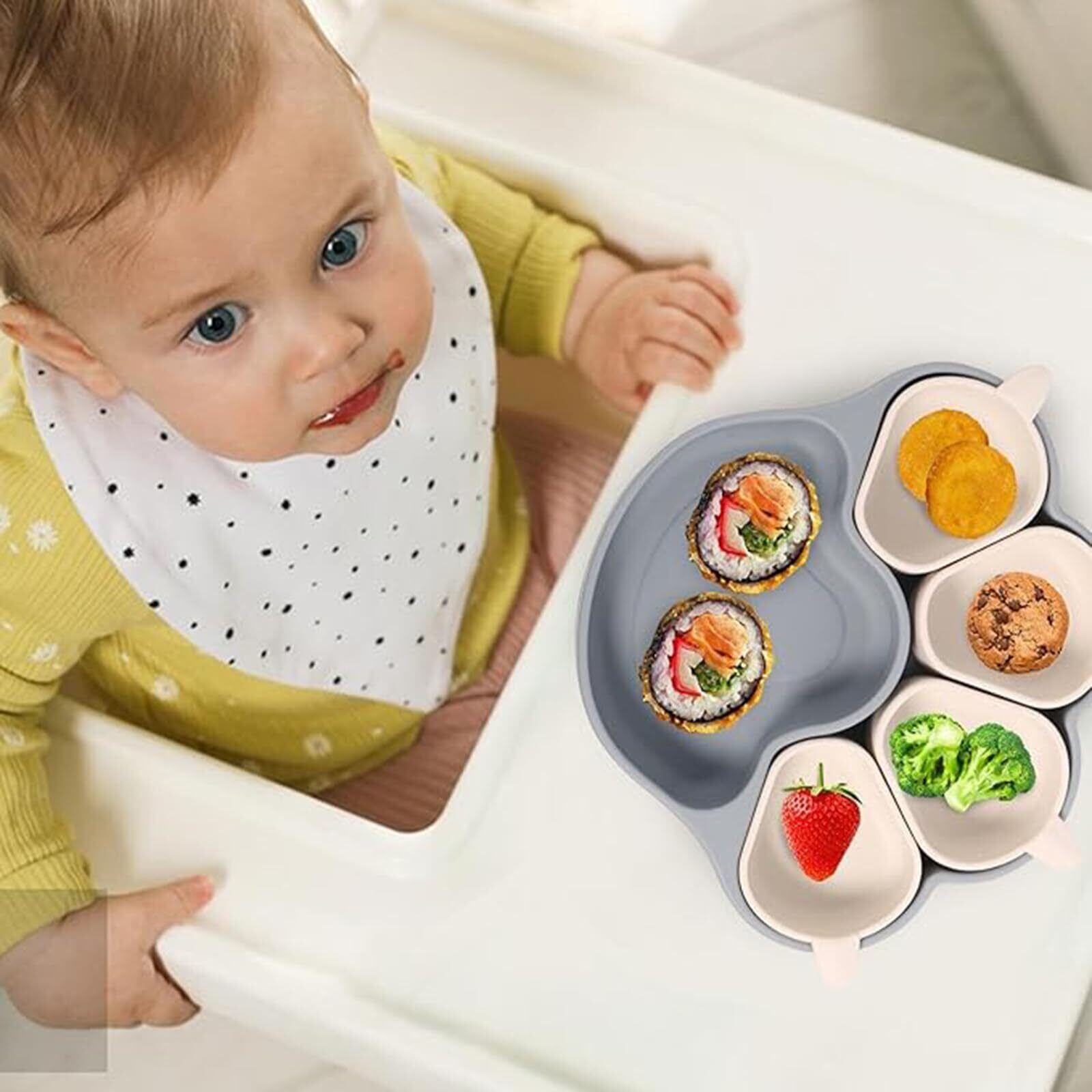 ベビープレートには5つのパーツがあり、取り外し可能なボウルが4つ入っているので、バランスの取れた食事を作るのに最適です。各セクションごとに異なるフードグループのためのスペースが設けられており、さまざまな味や素材を取り入れやすくなっています。