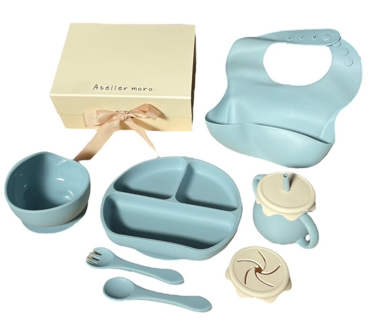 アトリエモロ ベビー食器セット 6点 シリコン製 くすみカラー 離乳食用 電子レンジ対応 食洗機対応 吸盤付き 出産祝い ギフト プレゼント ベビー食器 赤ちゃん 食器 男の子 女の子 (ブルー)