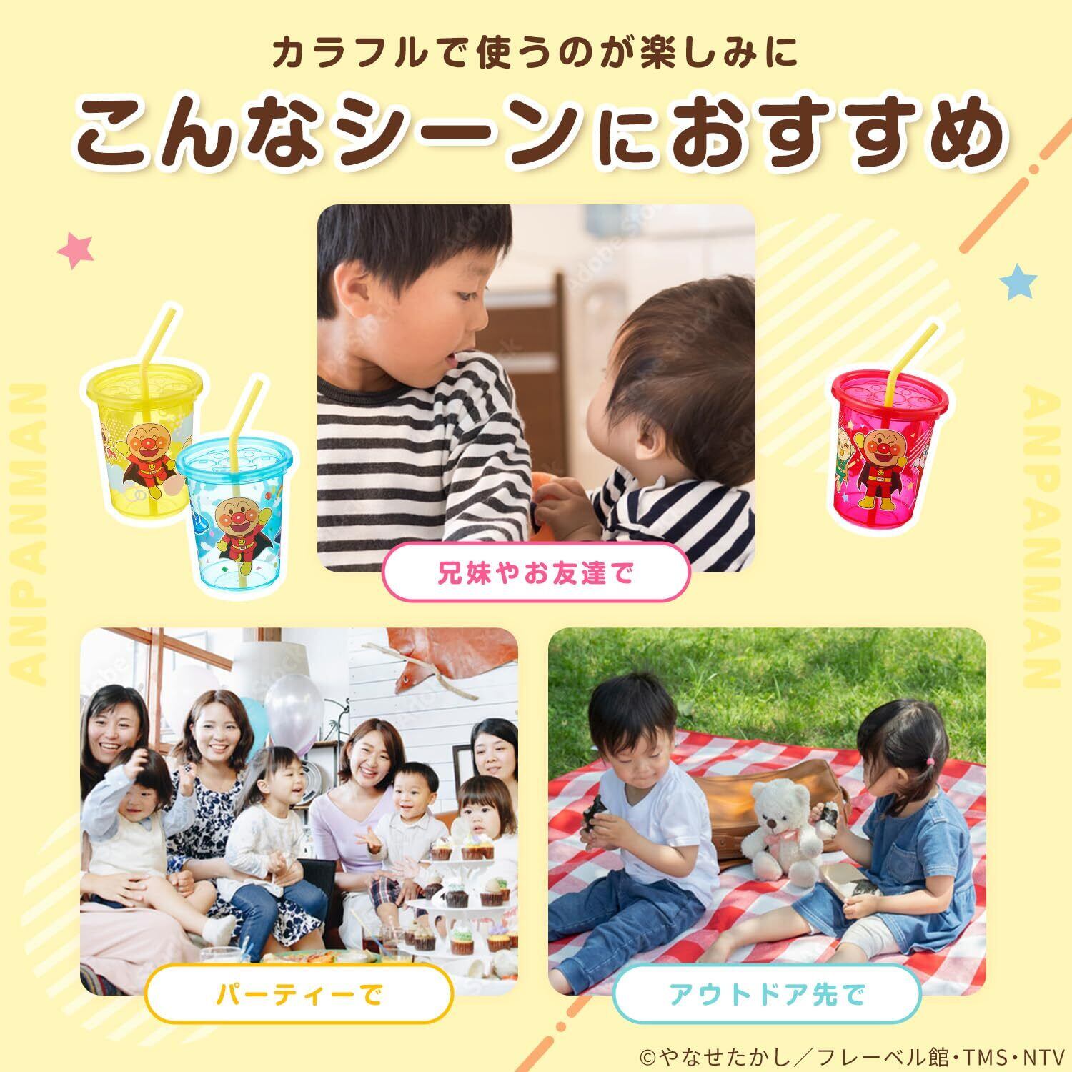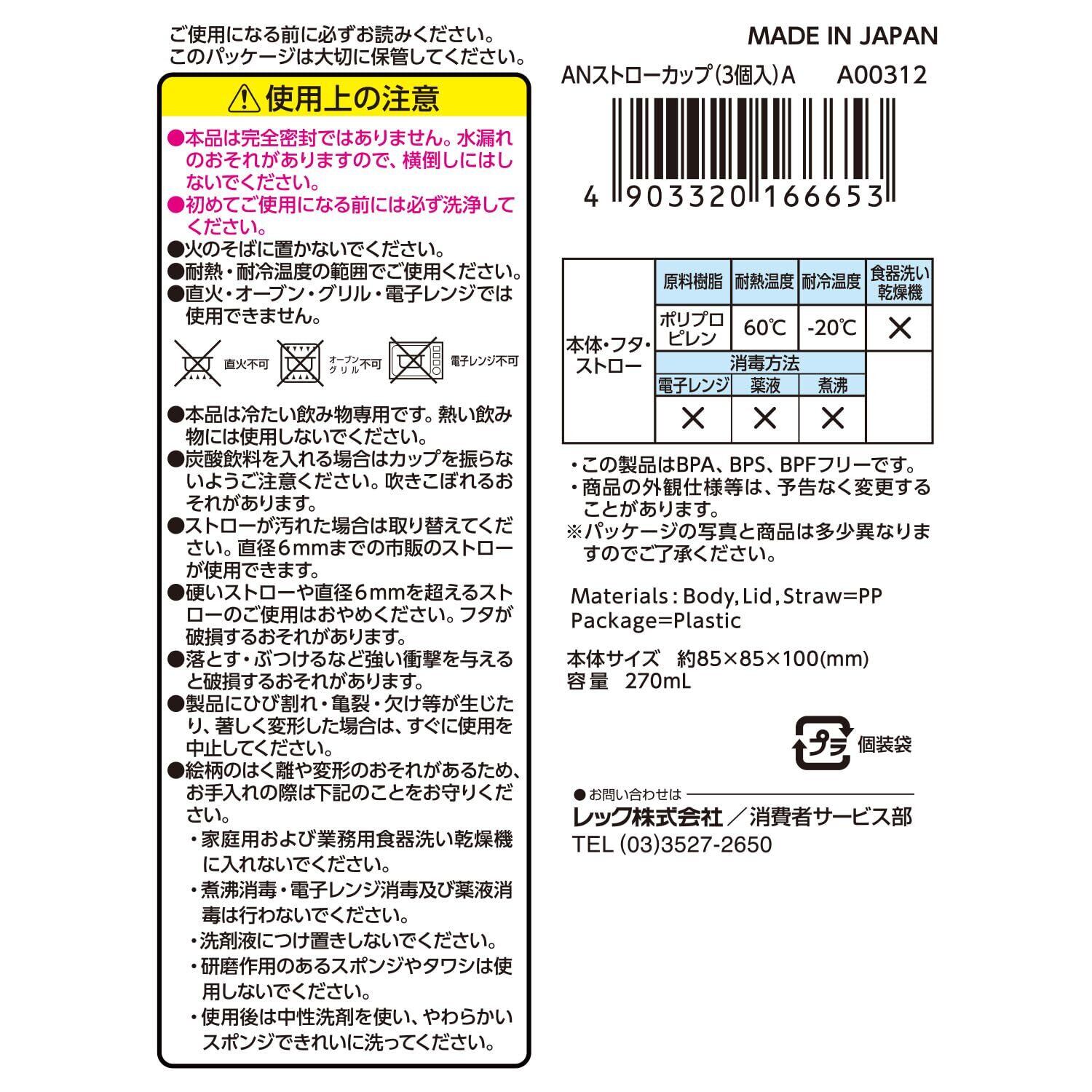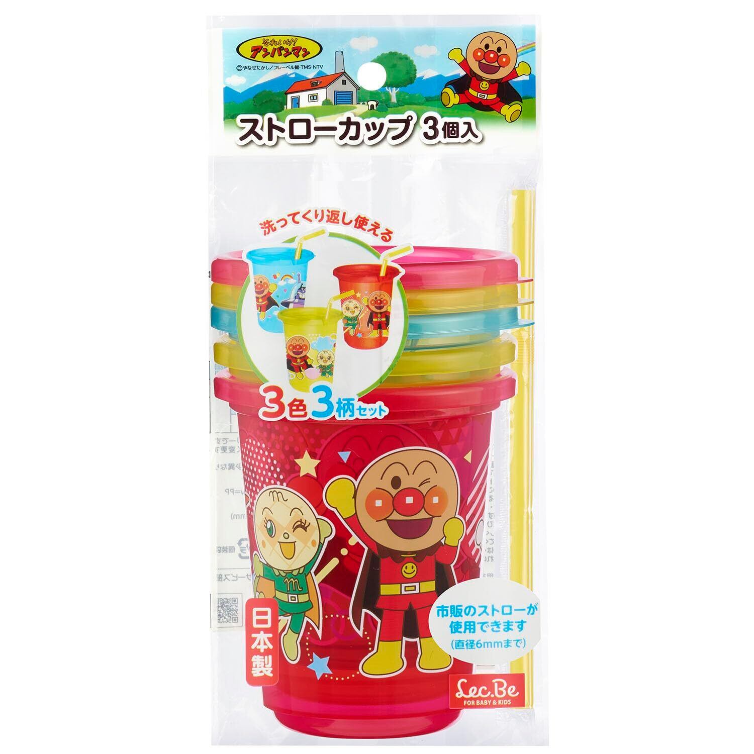 レック アンパンマン ストローカップ (Aタイプ) 3個入 / 容量270ml / 3色3柄セット / 日本製/フタつき/ストロー付/市販ストロー使用可能