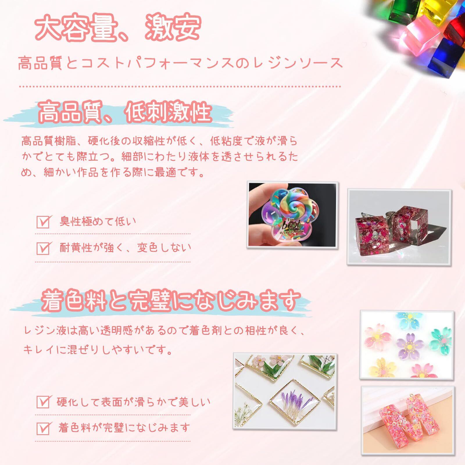 幅広い用途・DIY向け:アクセサリー制作、モールド成形、レジンコーティング、クラフト装飾、封入アートなど幅広い用途に対応。完成品は観賞用としてはもちろん、家族や友人へのプレゼントにも適しています。