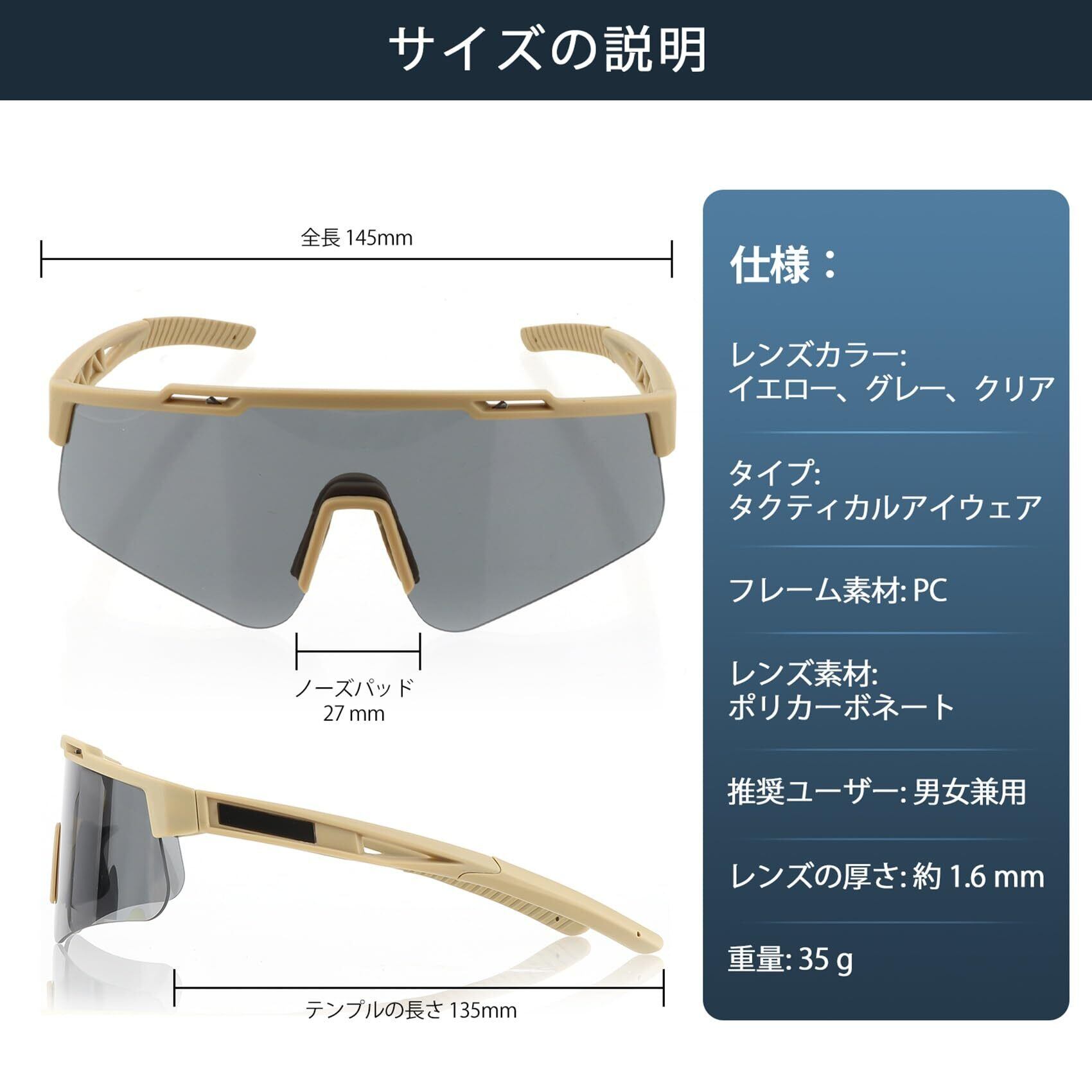 3枚異なる色の交換レンズ - レンズは耐衝撃性に優れたポリカーボネート素材で作られています。このタクティカルゴーグルセットには、異なる色のレンズが 3 つ含まれています。グレーレンズ: 日中の明るい光の条件に適しています。 光の強度を効果的に低減し、高強度の紫外線による目へのダメージを軽減します。黄色のレンズ: 夜間の暗い環境に適しており、夜間の視界がより鮮明になります。運転中に強い光が目を傷つけるのを防ぐことは、目を保護するだけでなく、運転の安全性も向上させます。クリアレンズ: 暗い場所でも視力を高め、より鮮明に見えるよう特別な多層コーティングが施されています。レンズの交換は簡単です