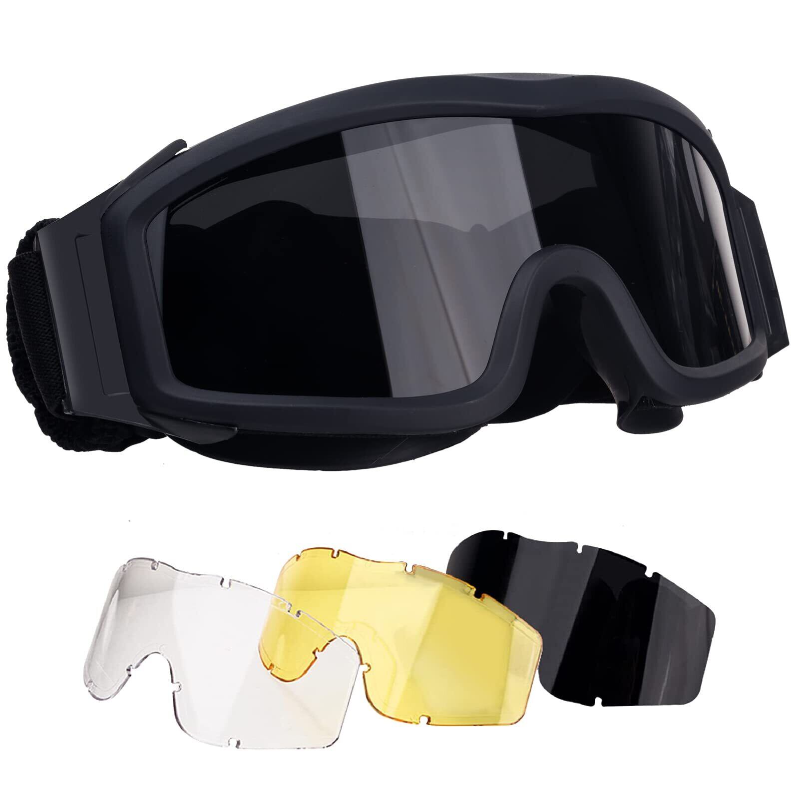 タクティカルゴーグル スポーツメガネ 3色レンズセット ゴーグル レンズ交換簡単 長さ調節可能 耐衝撃 通気性 防風 防塵 サバゲー サングラス(Black)