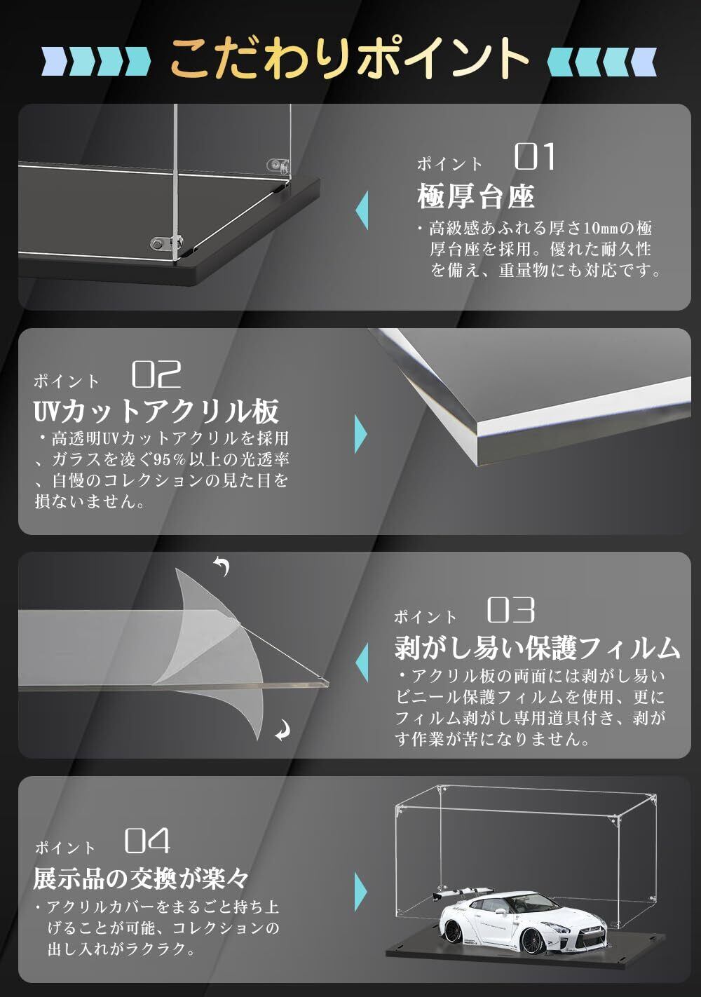 【見栄えアップ】高透明UVカットアクリル素材を使用、大切なコレクションを紫外線によるダメージから守ります。優れた耐久性と高い透明度を兼ね備えているため、ホコリやキズから守ると同時にコレクションをアクリル越しでもキレイに魅せます。