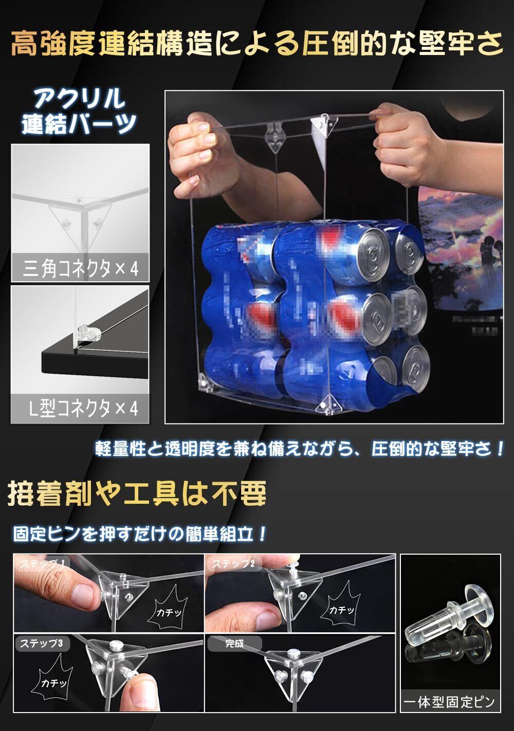 【組立簡単】固定ピンを押すだけの簡単取付、接着剤や工具は不要です。組み立て時に指紋や埃が付かないように手袋とクロスが付属、アクリル面をクリアに保つことが出来ます。アクリル板には剥がしやすい保護フィルムを採用、更にフィルム除去ツール付き。フィギュアケース全体を持ち上げても崩さない、展示物の出し入れが楽々。