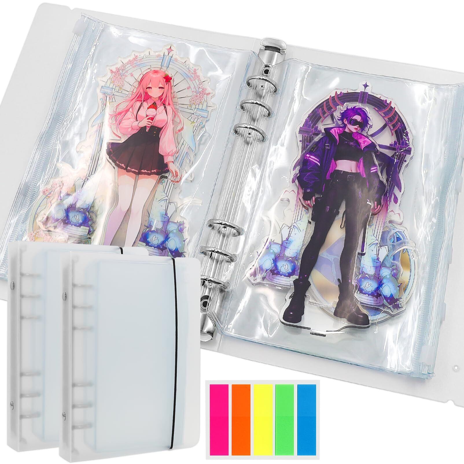 【商品仕様】アクリルスタンド 収納の仕様は次の通りです。 バインダーサイズ:23×17.5×3センチメートル*2個、ポケットサイズ:21×15センチメートル*20枚、5色付箋*20枚、ページ数:最大20ページ収容可能(最大20個のアクリルスタンドを収納できます)。