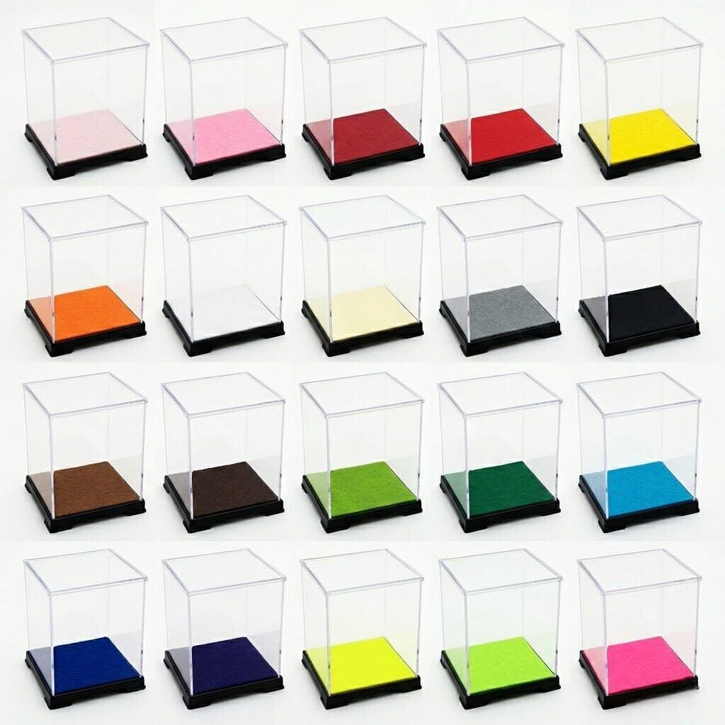 コレクションケースは底板(黒色厚さ約1mm)及び天板(透明)はプラスチック(厚さ約1mm)、側面(周囲)は透明のプラスチックシート(塩化ビニール厚さ0.35から0.5mm)で形成されています。