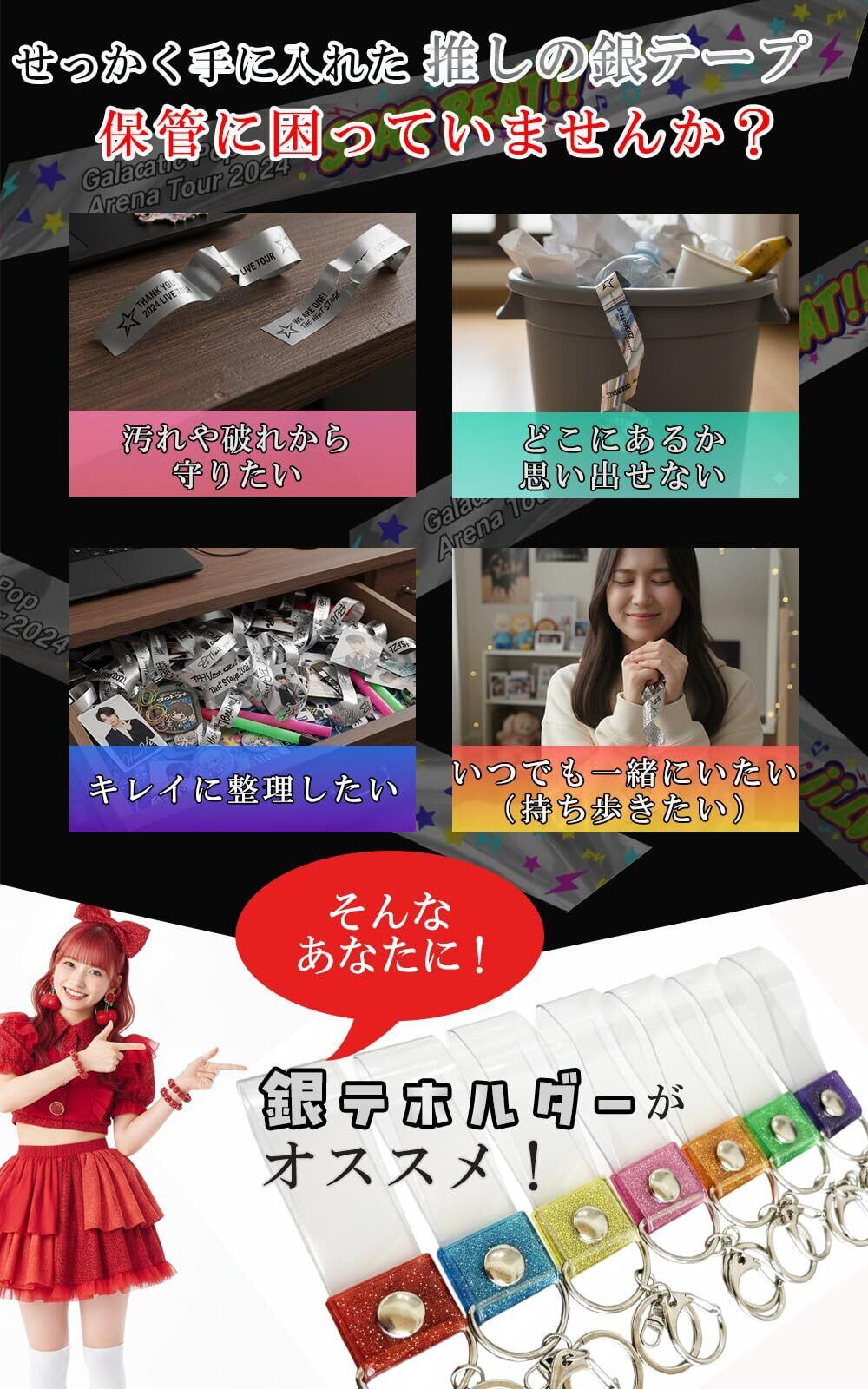 【商品仕様】ライブなどでゲットした銀テープを美しく・大切に保存することができるストラップです。いつでも大切な思い出を持ち歩きたい方にぴったりです。