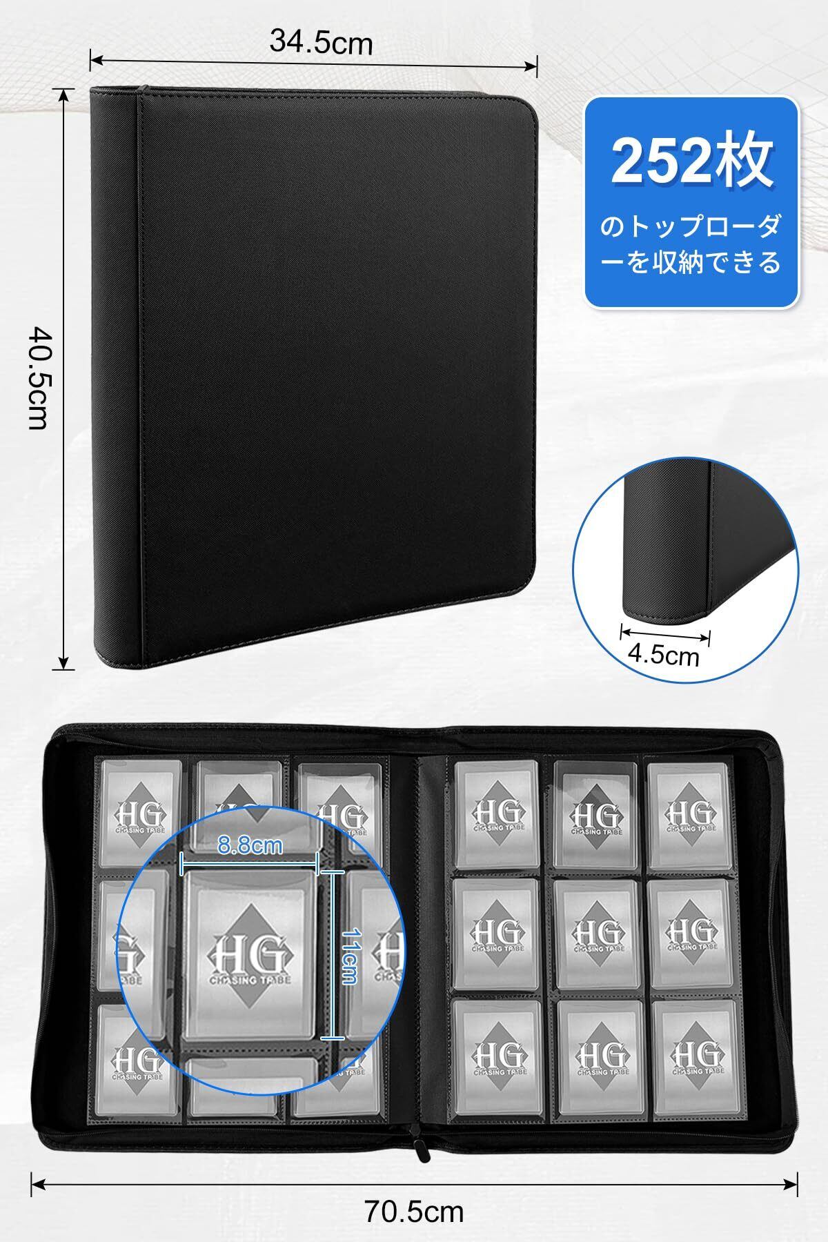 【製品仕様】カードファイル外寸:縦40.5cm 幅34.5cm 厚さ4.5 cm、カバー素材:上質PUレザー、内側の材質:上質のベルベット生地、ページ材質:高透明上質PP材質です、ページ数:14ページ各ページ9ポケット両面使用、トップローダー収納数:252枚、カード収納サイズ:幅8.8 cm縦11cm、トップローダーを完璧に収納し、各種コレクションカードに適用、スリーブが付いていても完璧に収納できます!