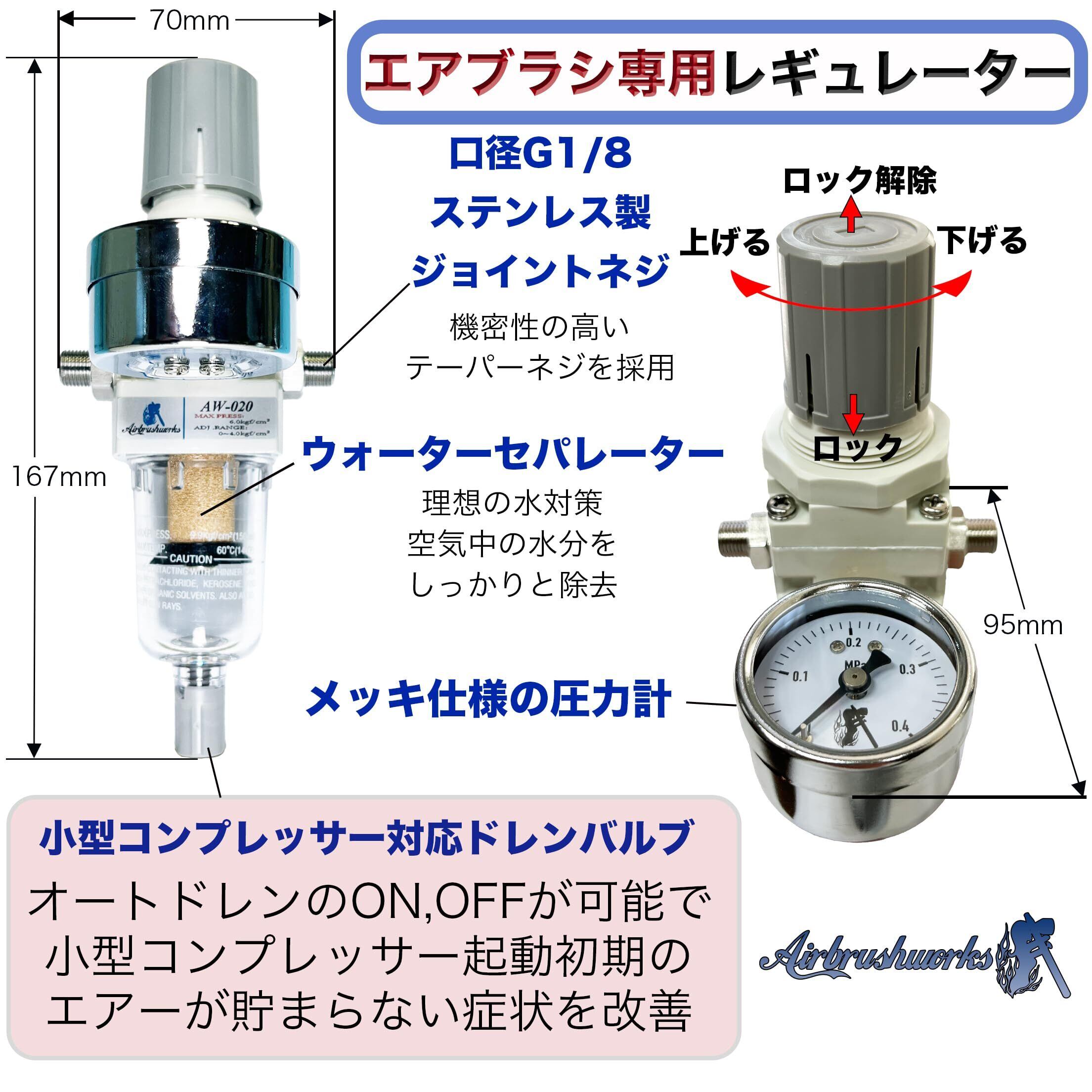 【エアブラシ用コンプレッサー対応ドレンバルブ搭載】 通常のレギュレーターはコンプレッサーが起動すると自動的に排水する機能を搭載していますが、エアブラシ用の小型コンプレッサーはエアフローが少ないため、自動的にエアーが止まらない欠点があります。AW-020は、エアブラシ用の小型コンプレッサーに対応し、自動排水機能をONとOFFに切り替え出来ます。OFFにする事により起動時にエアーが止まらない問題を解決できます。