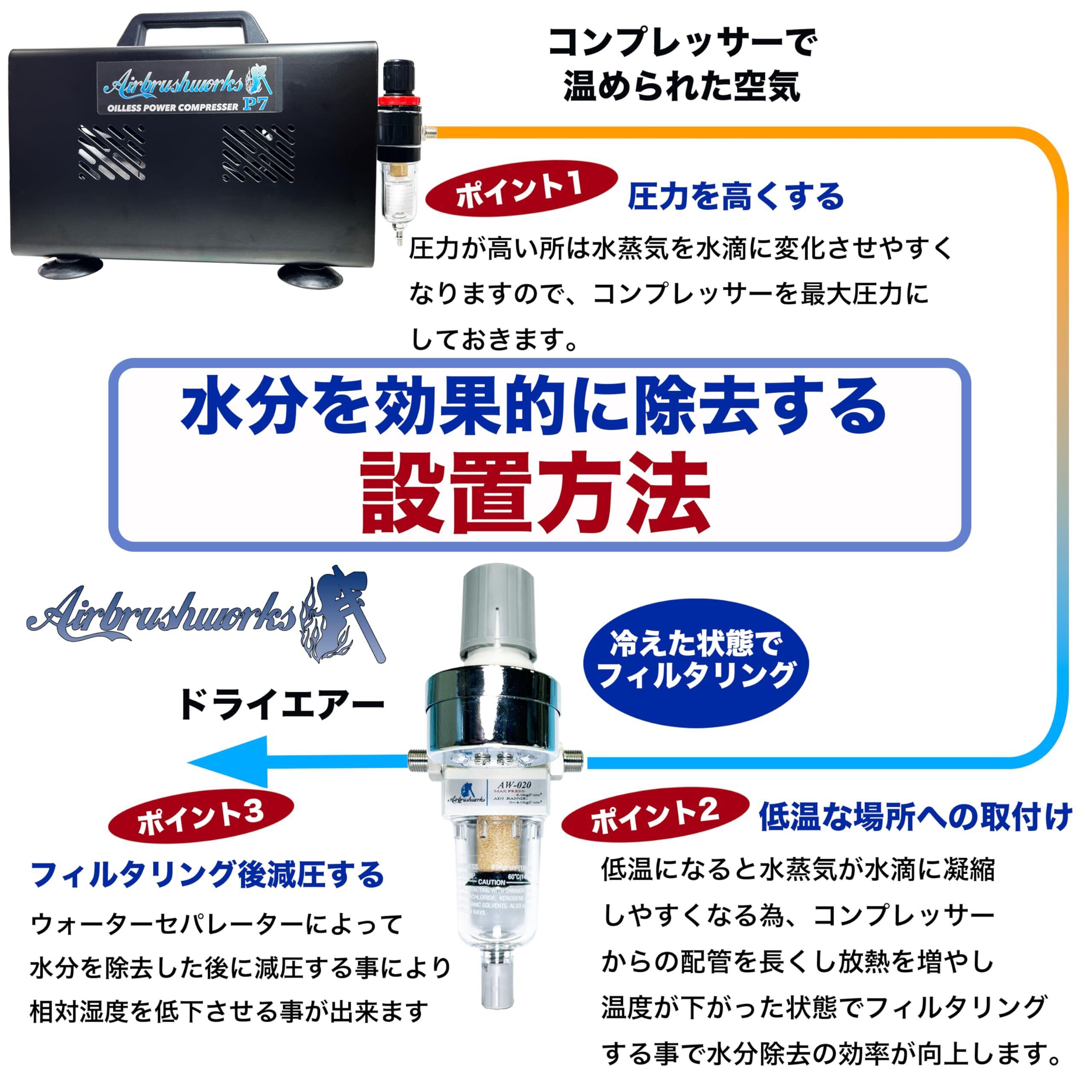 【理想的な水分対策】 本機をコンプレッサーから離れた場所に設置することで、コンプレッサーで熱された空気が冷却された状態でフィルタリングできます。この方式により、空気中のほとんどの水分を取り除くことができ、最適な水分対策のエアーシステムを構築できます。(定期的な水の排出が必要です)