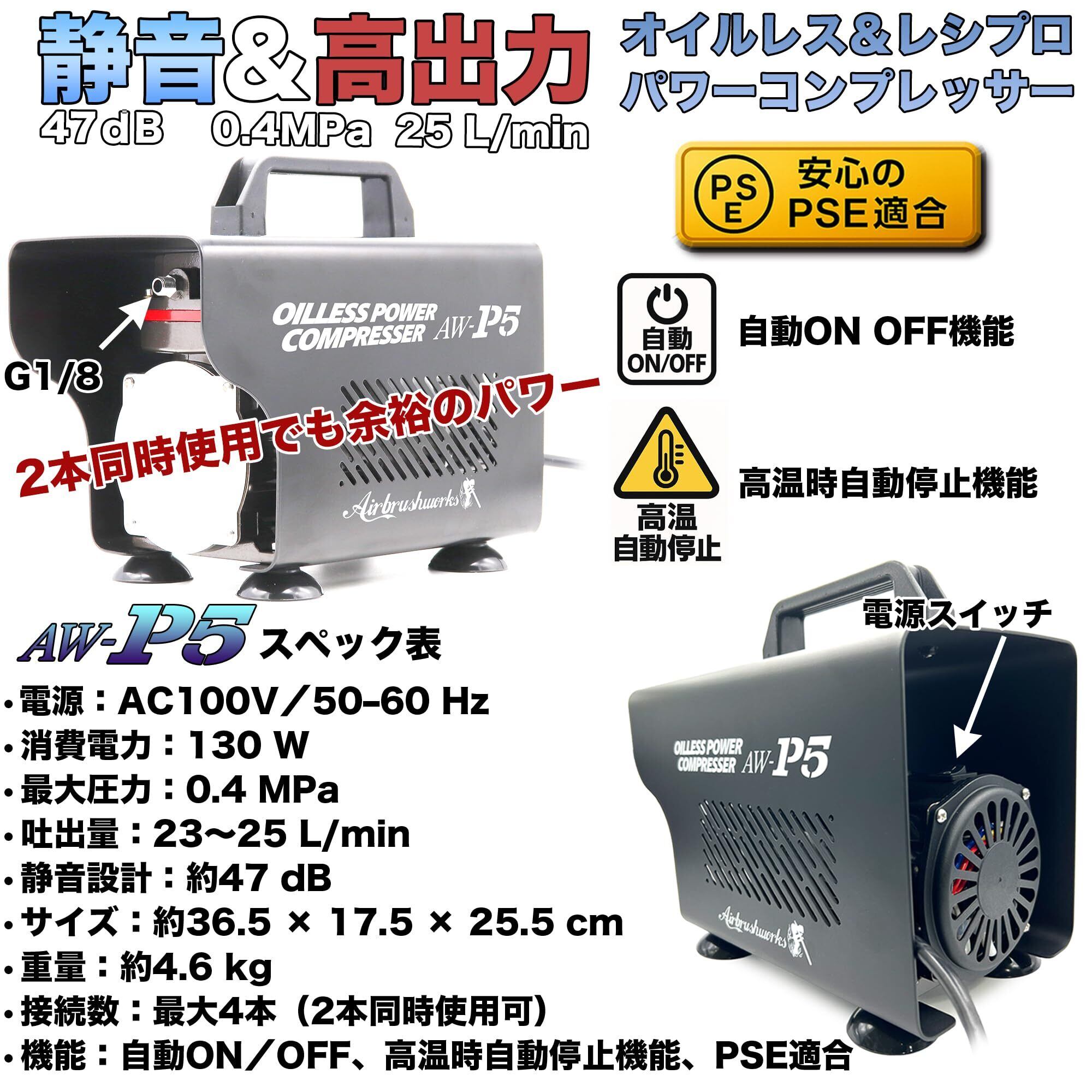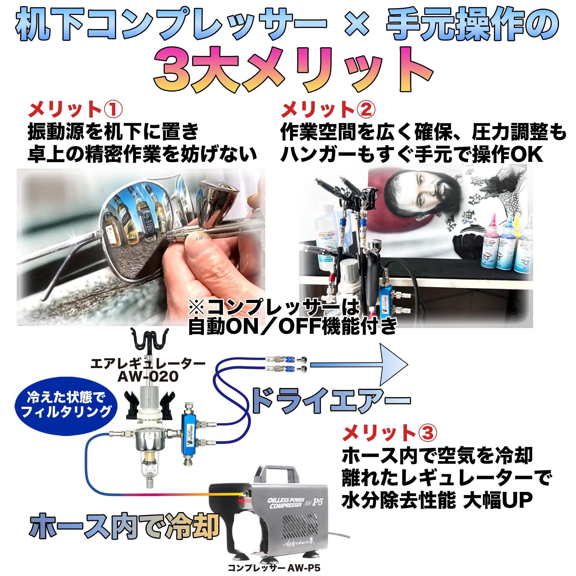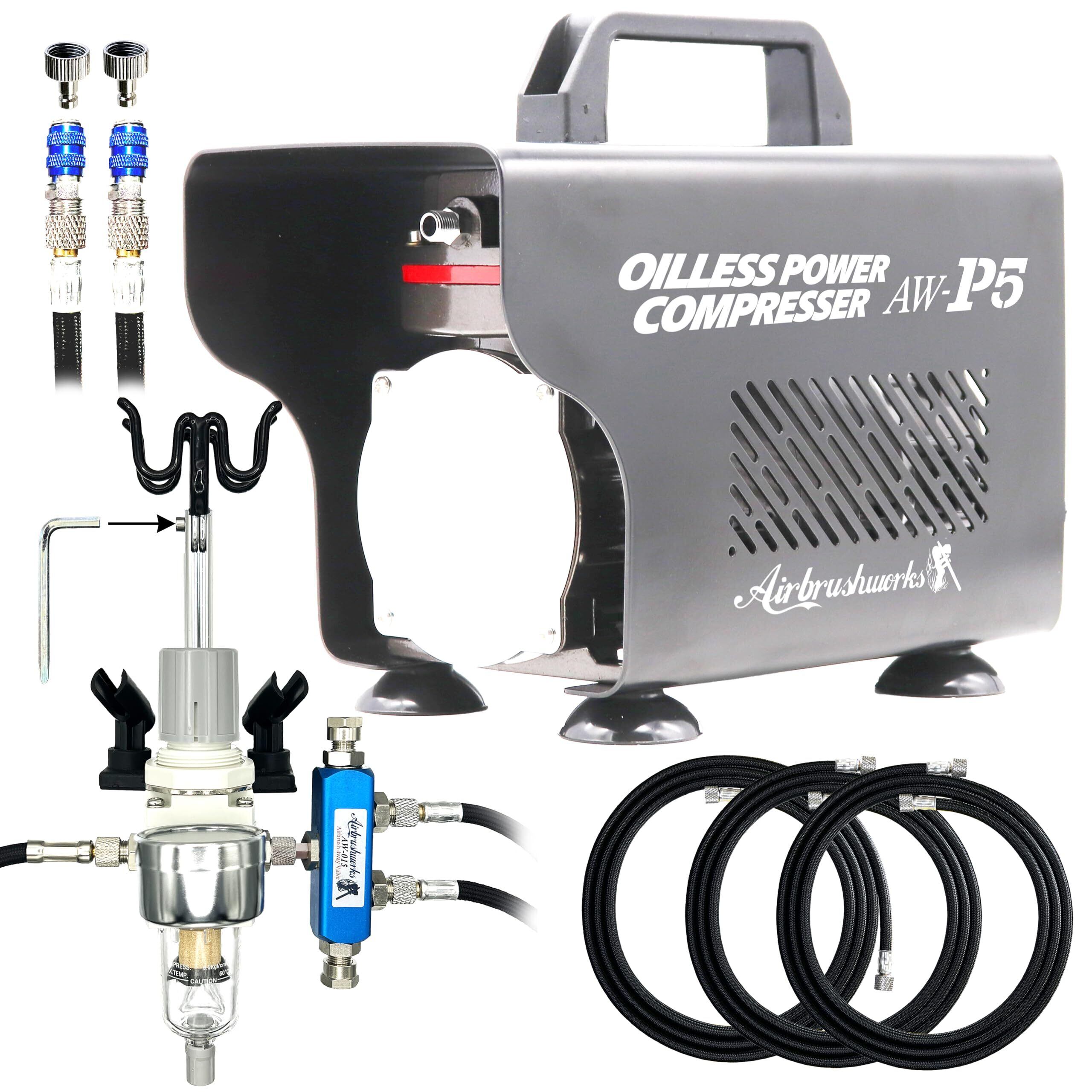 プロ監修 エアブラシ コンプレッサー エアブラシ用 パワー コンプレッサー プラモデル AW-P5 静音 プロのエアーシステムを卓上に 4本接続 2本同時使用可能 レギュレーター&ハンガー付き