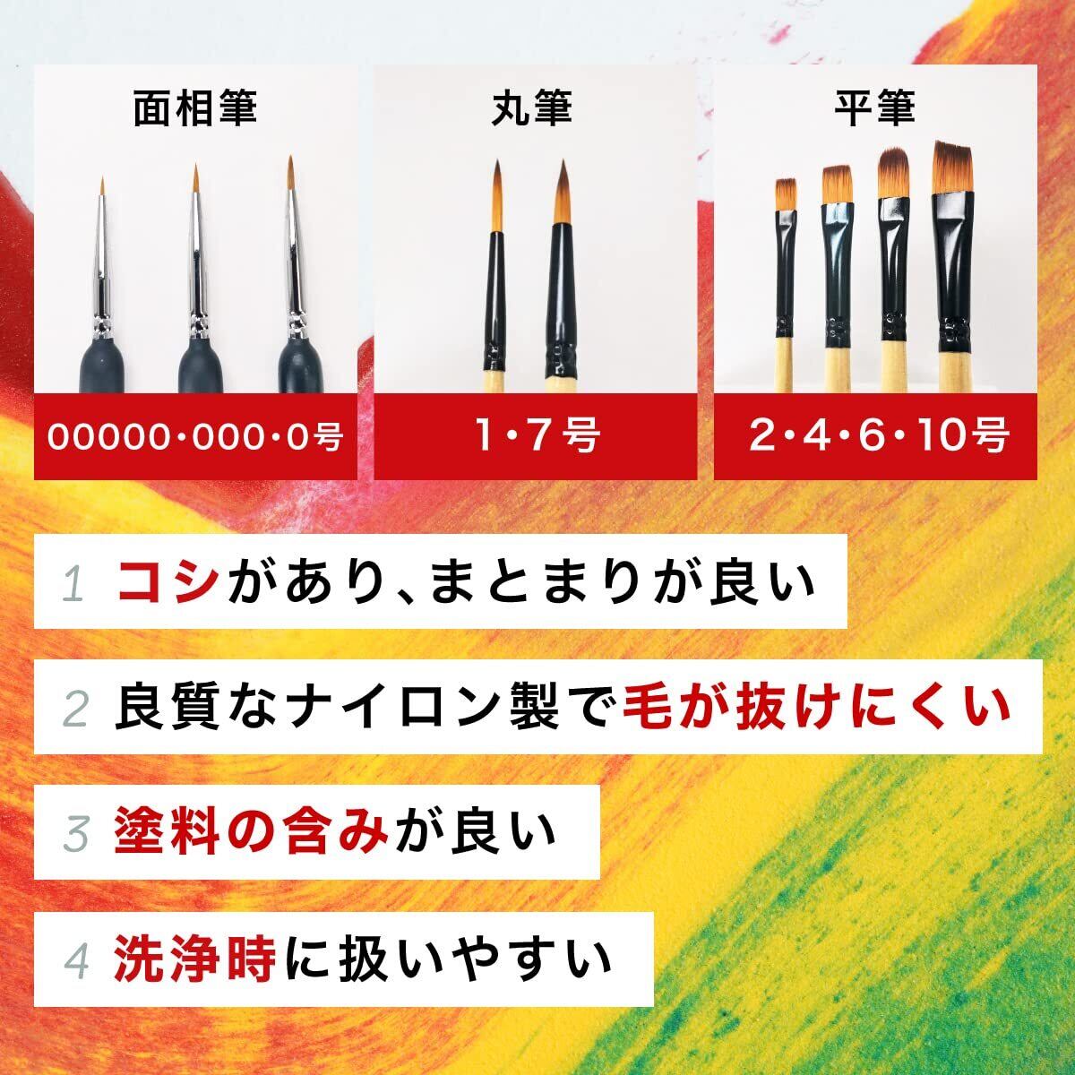 セット内容:平筆:4サイズ各1点(2・4・6・10号) 丸筆2サイズ各1点(1・7号) 面相筆:3サイズ各1点(00000・000・0号) マスキングテープ6㎜×17m・10㎜×17m各1点 塗料皿2点 撹拌棒1点 スポイト3㎜1点 収納ケース1点