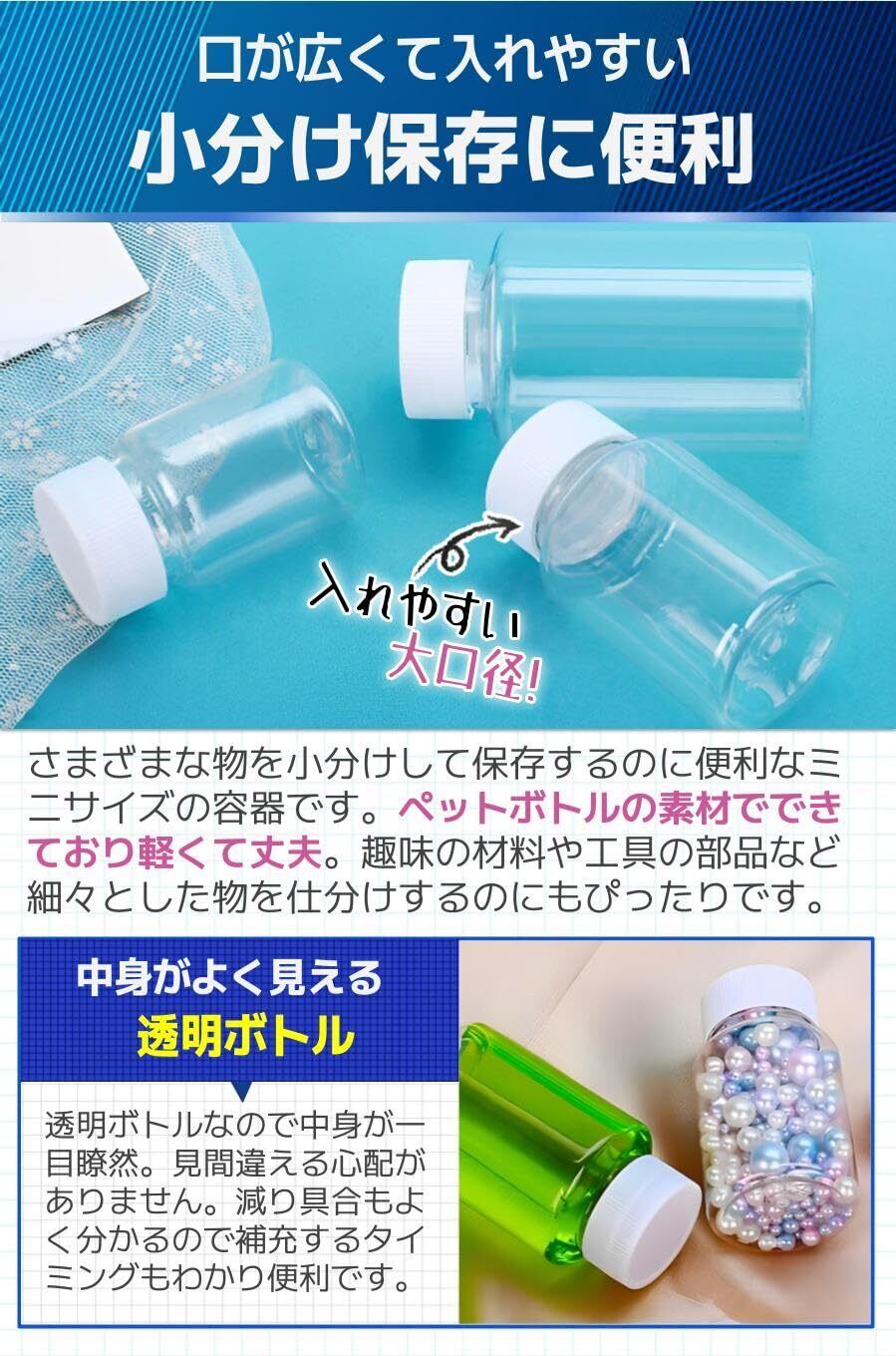 【小分け保存に便利】さまざまな物を小分けして保存するのに便利なミニサイズの容器です。ペットボトルの素材でできており軽くて丈夫。趣味の材料や工具の部品など細々とした物を仕分けするのにもぴったりです。