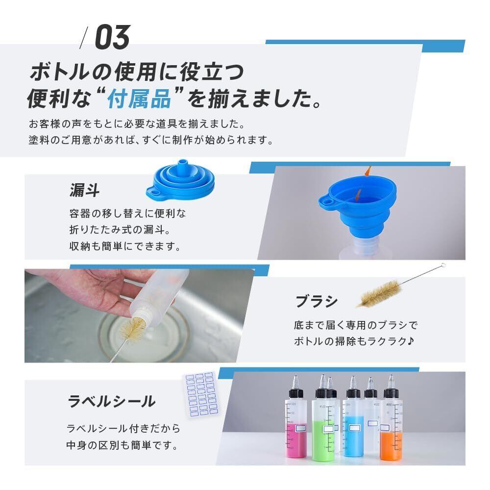 【お客様の声をもとにドロッパーボトルの使用に必要な付属品をおつけしました!】塗料の移し替えに便利な漏斗、塗料ボトルの洗浄に便利なブラシ、ボトルの識別に便利なラベルシールの3つを付属品としておつけしました。