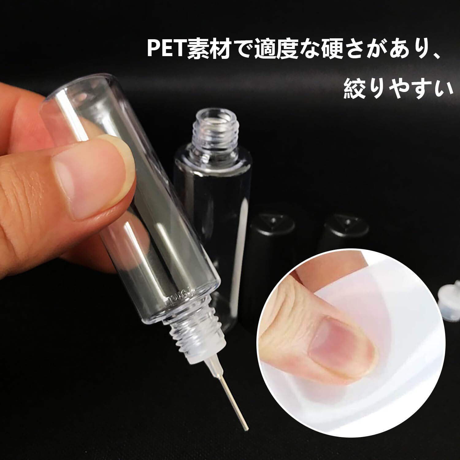 【透明タイプなボトル】透明なボトルなので中身が確認しやすく、残量が一目でわかります。各ボトルはしっかりとフィットする先端キャップを備え、先端を保護し、液体の漏れを防ぎます。ボトル内の液体の揮発を減らし、原材料を節約し、次回の手動使用を容易にするために、使用後はすぐに蓋を閉めてください。
