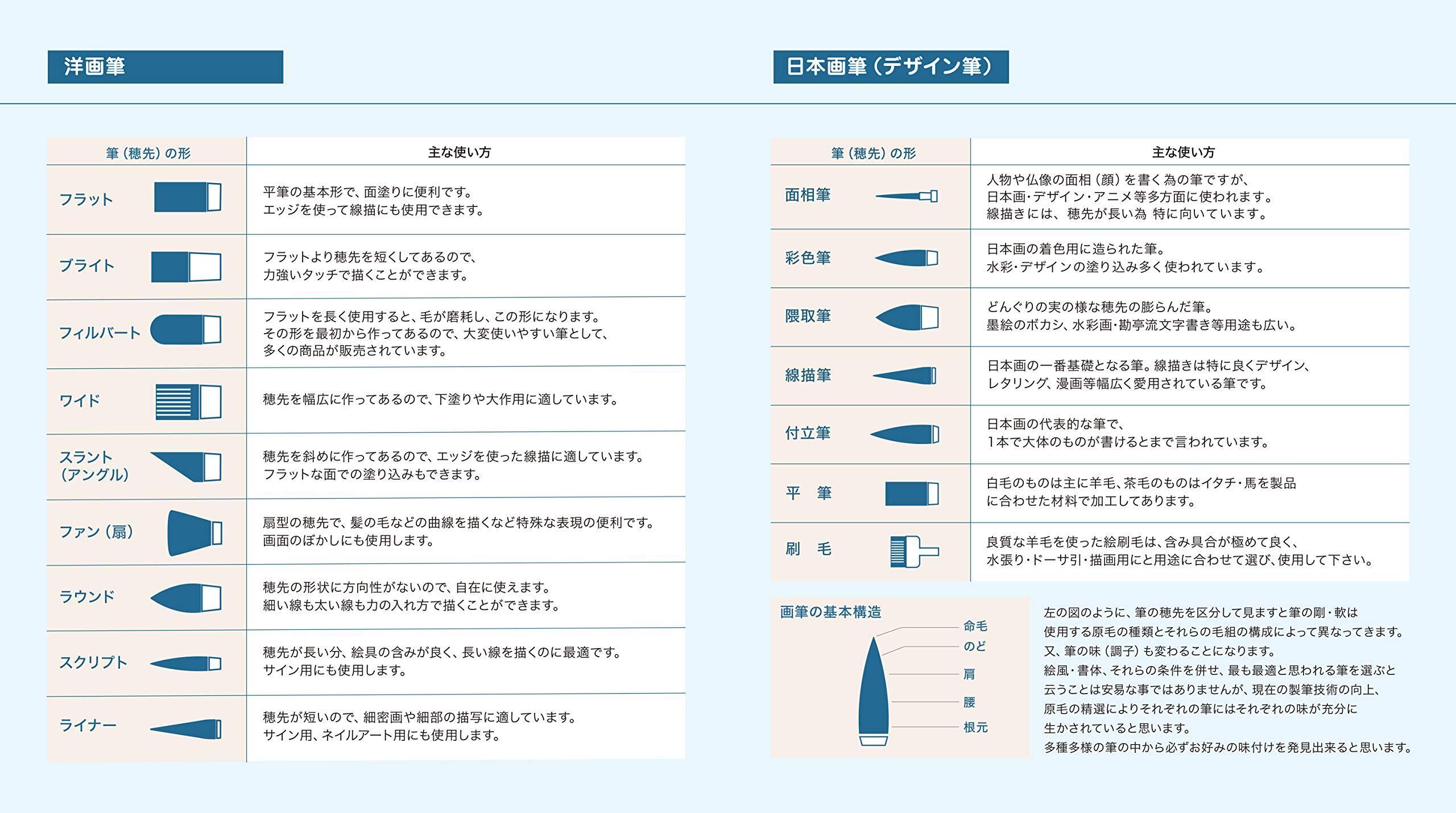 毛先形状タイプが3タイプ(ラウンド・フィルバート・ブライト)あり、お好みで使い分けができる