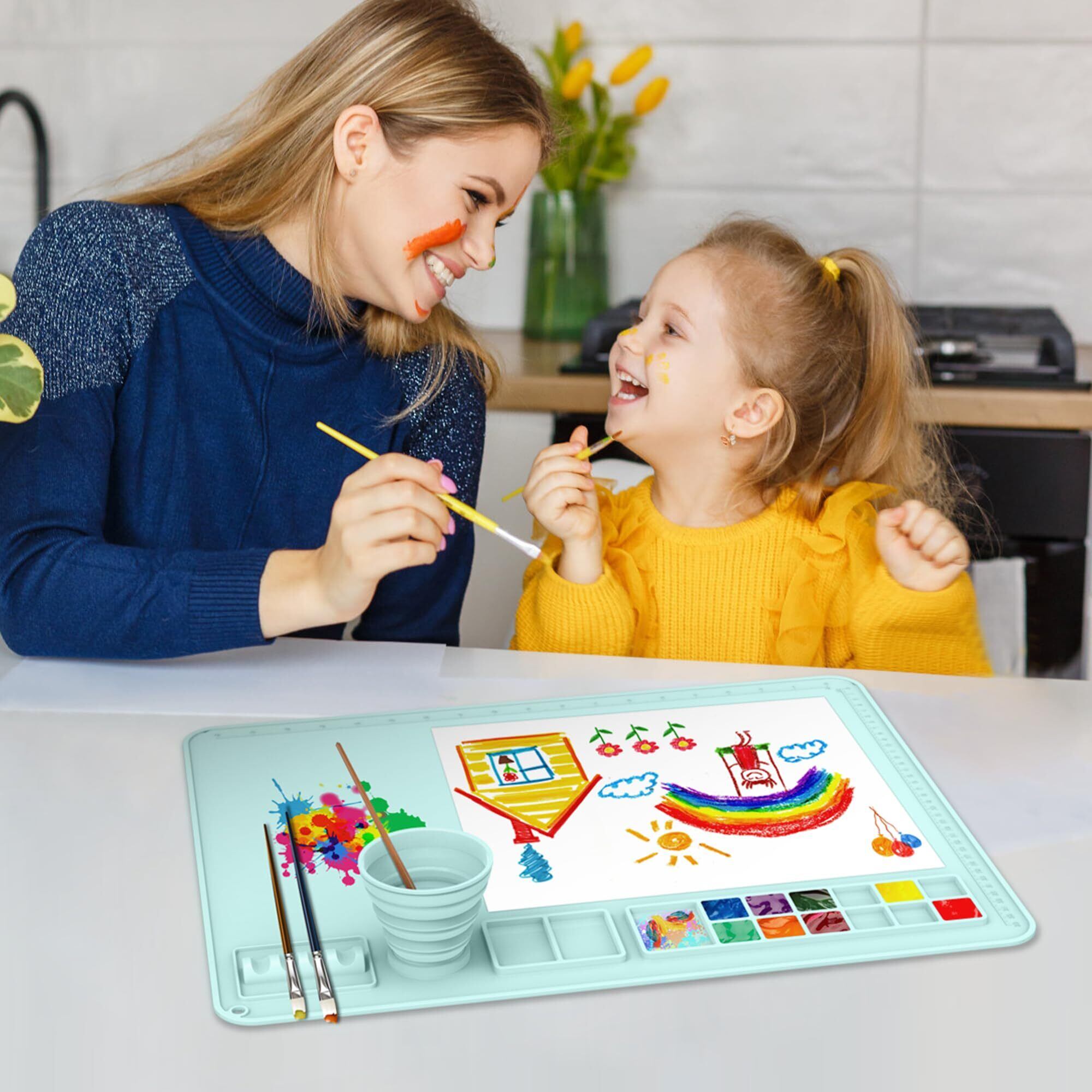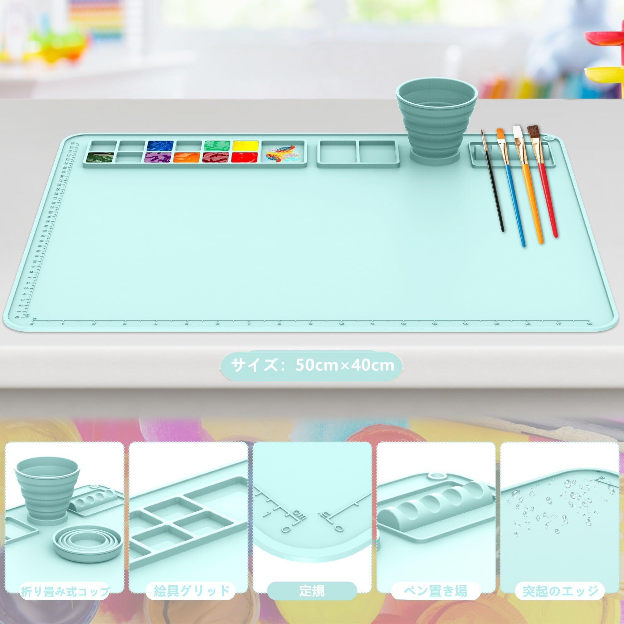 シリコンクラフトマット、絵の具パレット、カップ付きの绘画用マット、50×40cm絵の具・レジン・粘土用シリコンマット、子供絵画 油絵水彩兼用パレット、画材 (青)