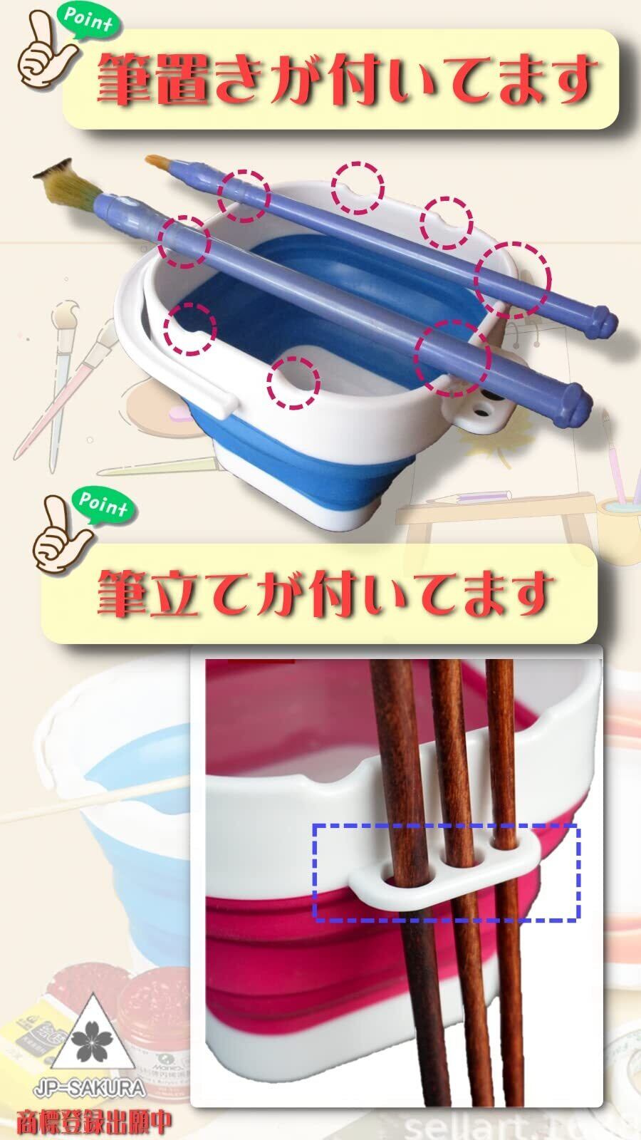 収納に便利な折り畳めるバケツ 持ち運びに便利な取っ手付き、 バケツの淵には筆置き用のくぼみがあり筆が置ける設計になっています。 バケツ側面には筆立て用の穴がついてます。