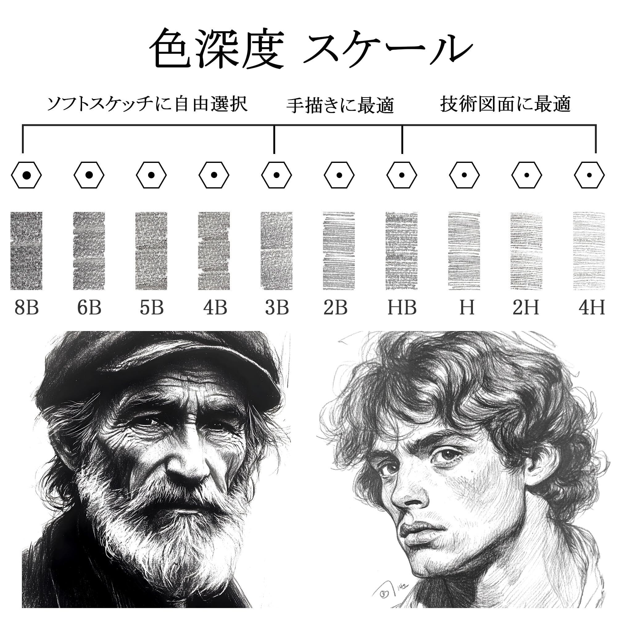 多様な鉛筆硬度レンジで幅広い表現が可能:4Hの硬めの芯でシャープなラインを描き、8Bの柔らかい芯で濃淡のある影を表現。スケッチやデッサン、クロッキー、建築図面、漫画の下書きなど、多様な用途に対応できる万能な鉛筆セットです。異なる硬度を組み合わせることで、より豊かな質感と奥行きを演出できます。