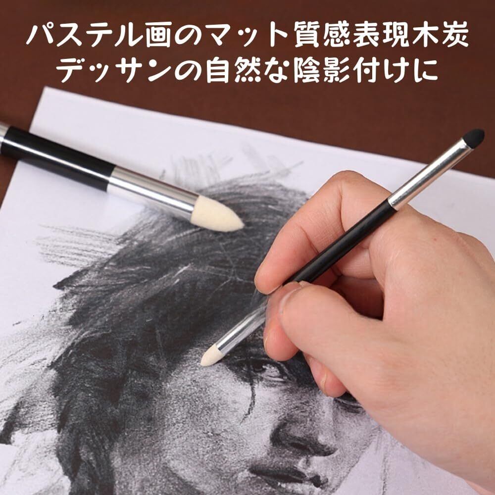 【使用方法】紙擦筆,先端汚れ時は紙の目線に沿って手で裂くだけ,常に清潔な状態を維持。精密作業に最適、細部のぼかし~広範囲のグラデーションまで自在対応 。スポンジ擦筆ダ,繰り返し洗えて環境に優しい ,パステル画のマット質感表現木炭デッサンの自然な陰影付けに 。紙ヤスリ,鉛筆を急速に薄く混合するのに優れています。デッサンやイラストを描くとき使っていくうちに汚れて黒くなってしまいます。汚れたら紙ヤスリを使うと綺麗にできます。