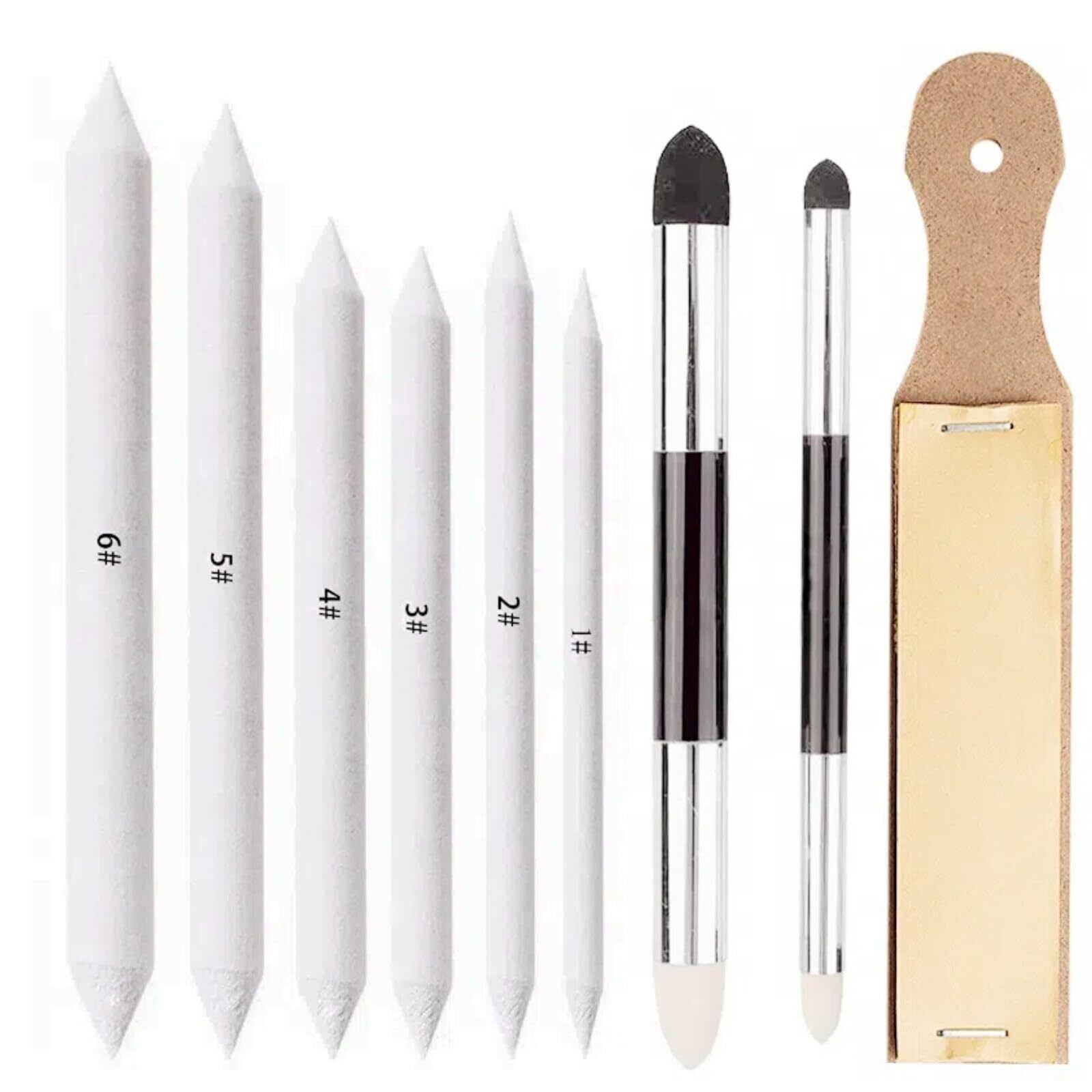 【商品の内容】スポンジ擦筆2本(2サイズ)、紙擦筆6本(#1、#2、#3、#4、#5、#6)、紙ヤスリ1本。デッサン,イラスト制作の必須ツール 。