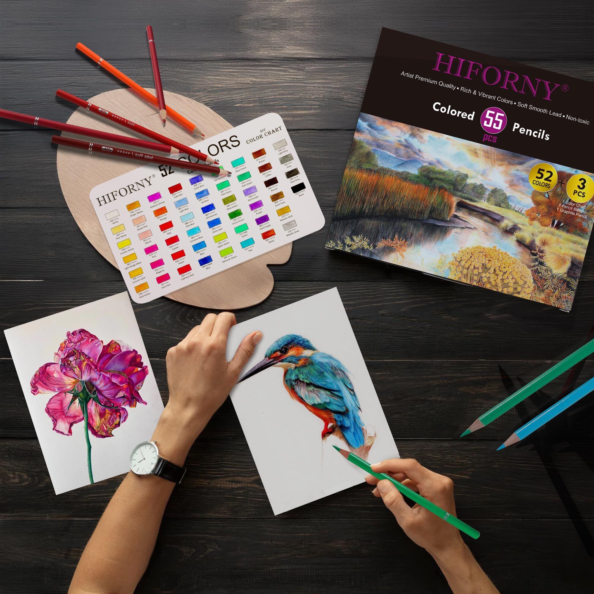 HIFORNY 55本パック 色鉛筆セット 大人用塗り絵用 52色 色鉛筆付き アーティストソフトコア 鮮やかな色 お絵かき鉛筆 アートクラフト用品 大人 初心者 子供用