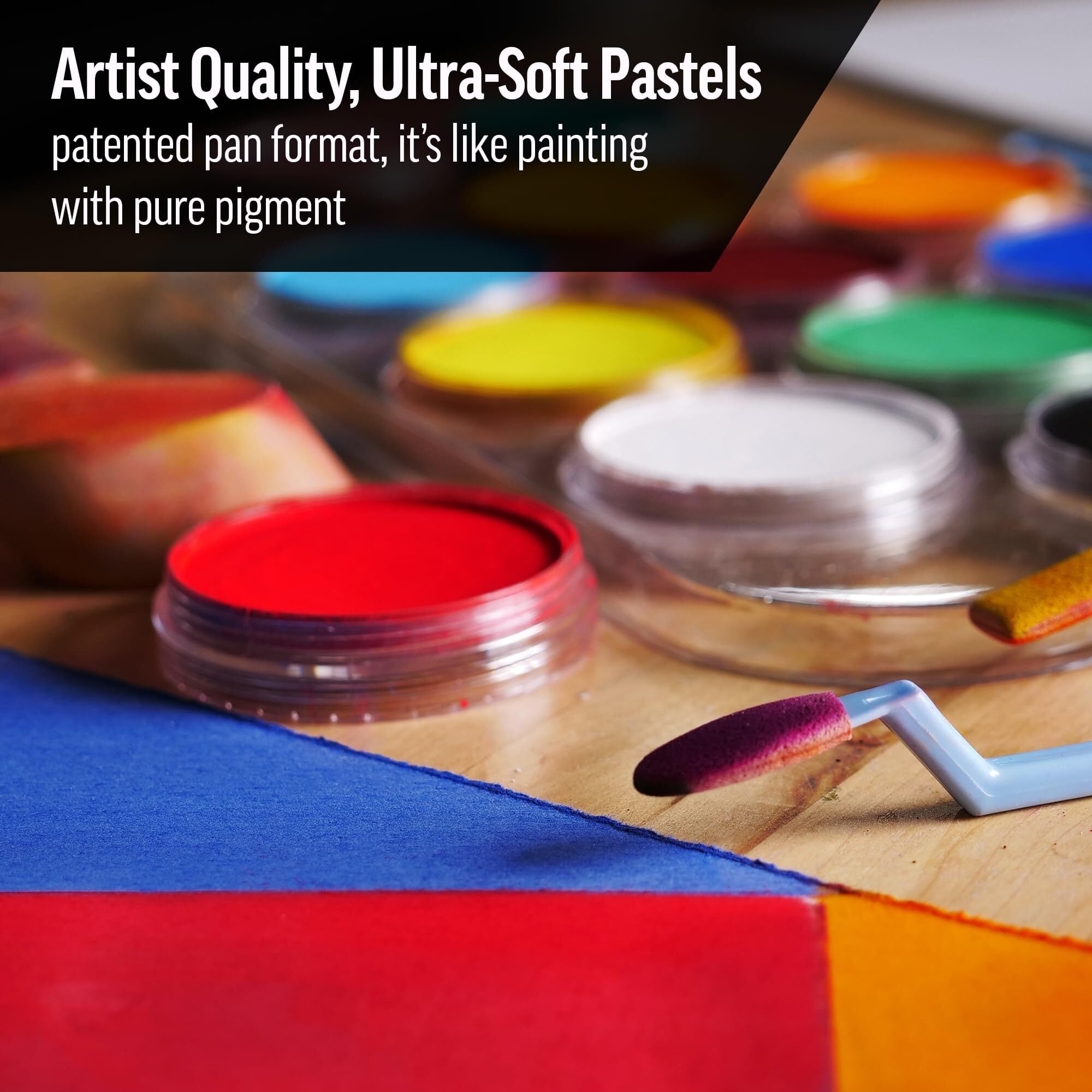 パンパステルはこれまでのスティックパステルでは難しかった技法を簡単に表現する新時代の色材です。パンパステルは絵具のように、色を取り、色をのせ、色を調整できるように考案されました。特別な処方により、高品質顔料と最低限の固着剤と添加剤で作られているために、非常にリッチでソフトで粉っぽさのないドライタイプの色材となっています。同時に、高い着色力と耐光性を持ち合わせています。たいへん伸びがよく広い面積も素早く塗ることができます。簡単に紙の上で混色できるので微妙な色合いも調節できます。美しいグラデーションが簡単にできます。ネリゴム等で簡単に消すことができます。ハイライト使いにも活用できます。重ねることがきるので幾重ものレイヤー表現が可能です。