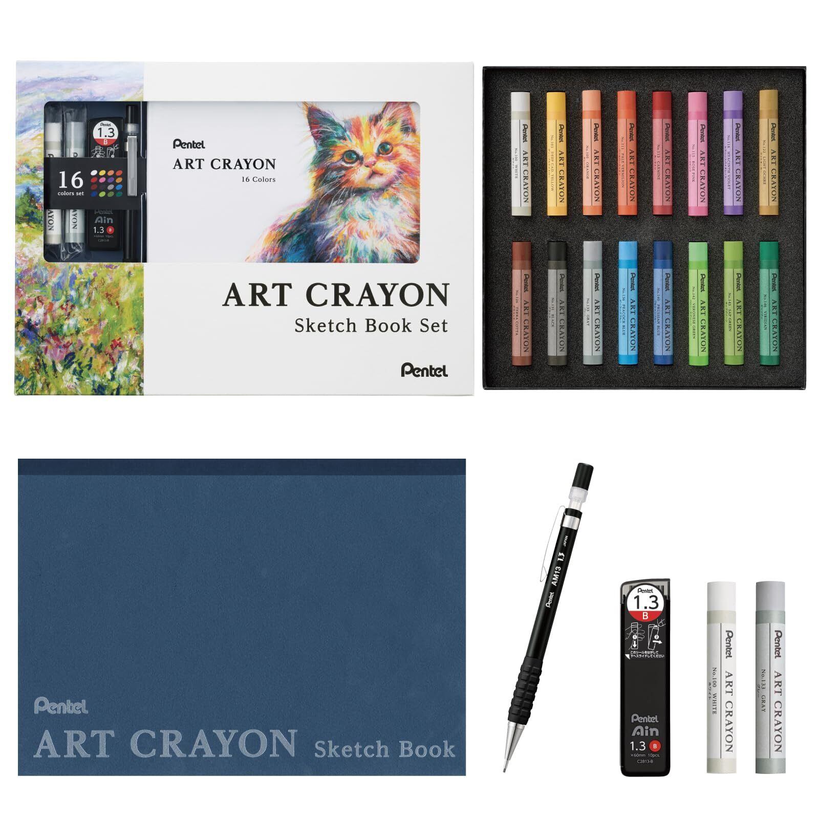 【新着商品】ぺんてる クレヨン アートクレヨン 16色セット 単色ホワイト/グレー シャープ・替芯 セット スケッチブック/描き方ガイド付き PTAC-16ST1