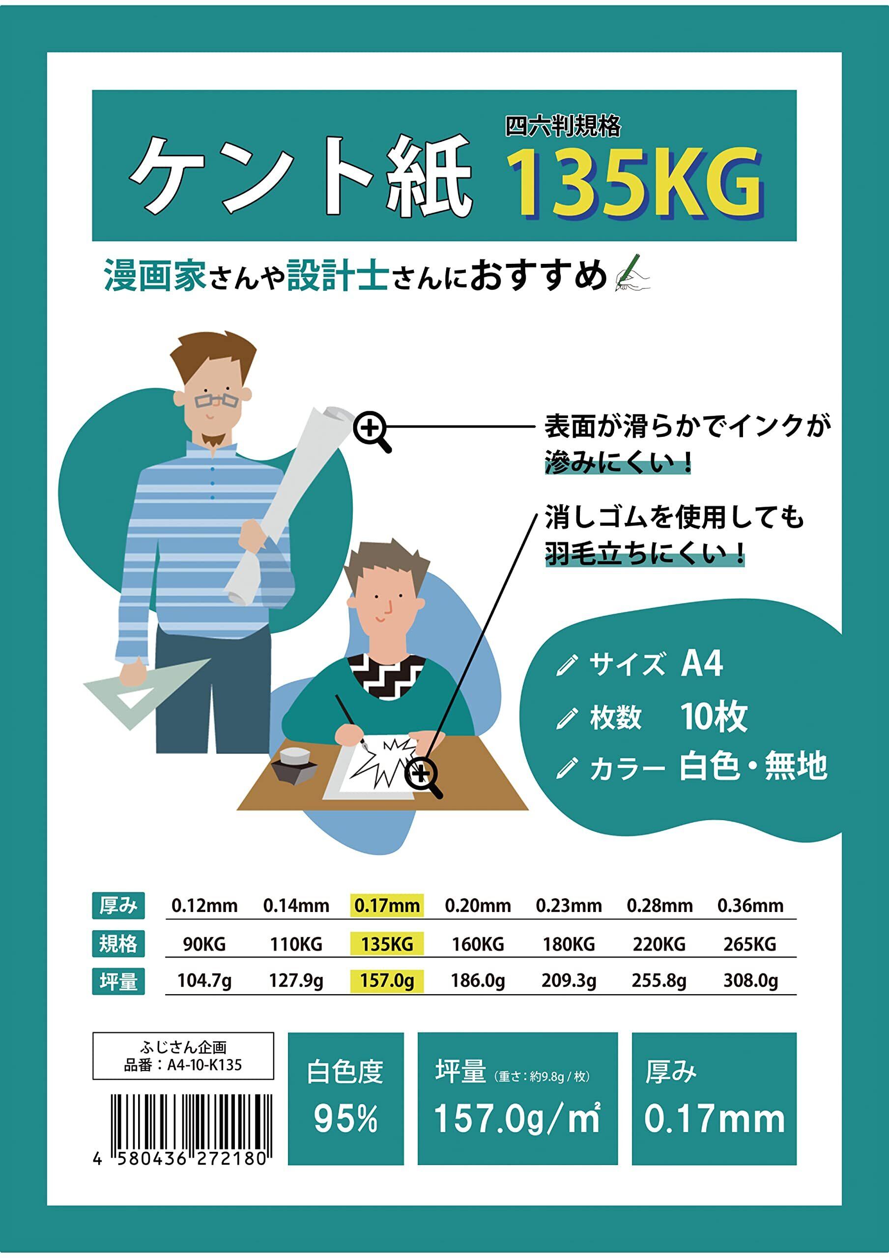 A4 ケント紙 135kg 画用紙 製図用紙 両面無地 日本製 157.0g/㎡ 白色度95% 紙厚0.17mm 10枚 A4-10-K135