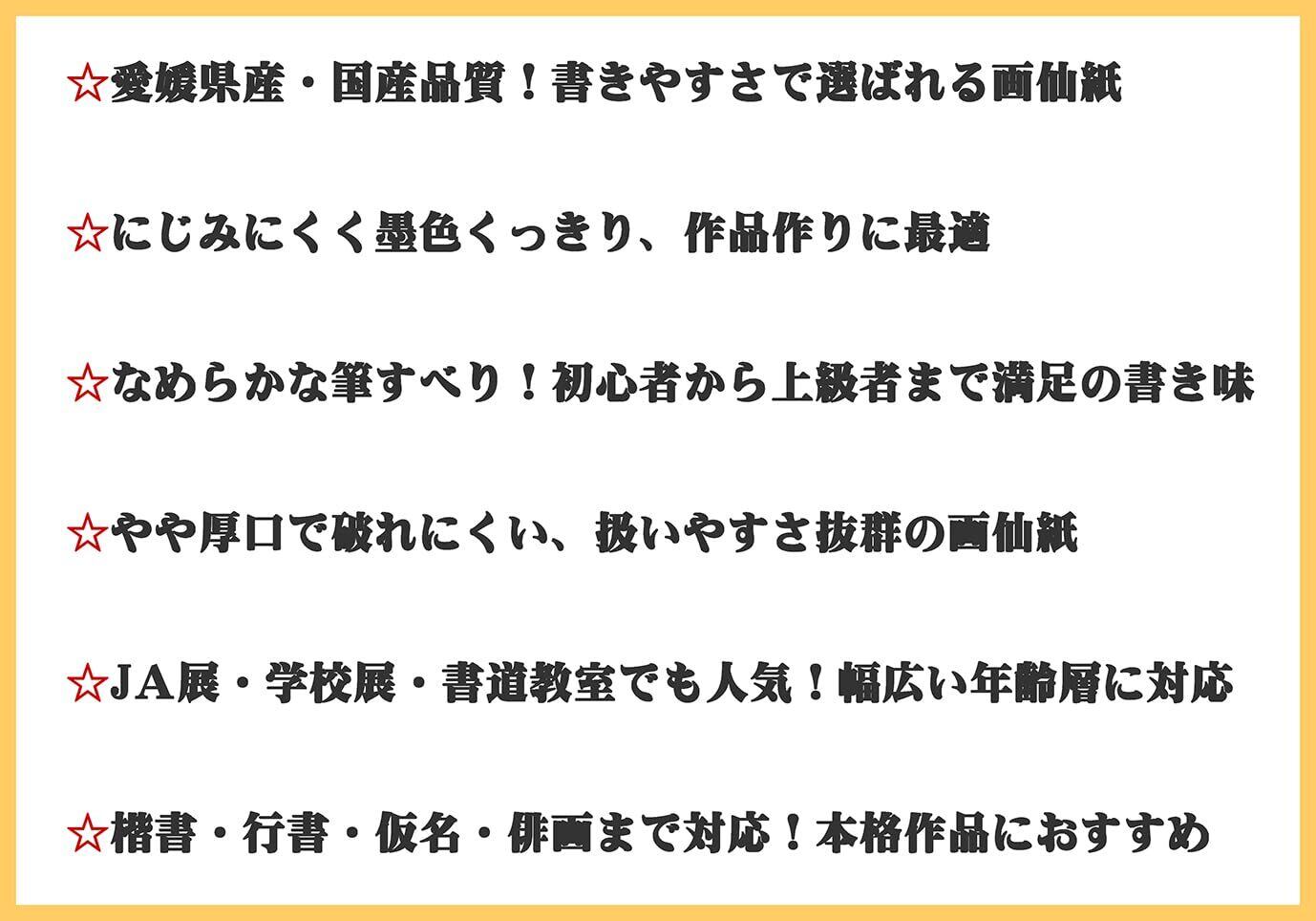 小中学生から大人まで使いやすい!JA展や書道作品づくりに最適な画仙紙。愛媛県で生産された、国産の高品質な書道用画仙紙です。やや厚口でしっかりとした紙質ながら、表面はなめらかで筆のすべりがよく、心地よい書き味を実現。