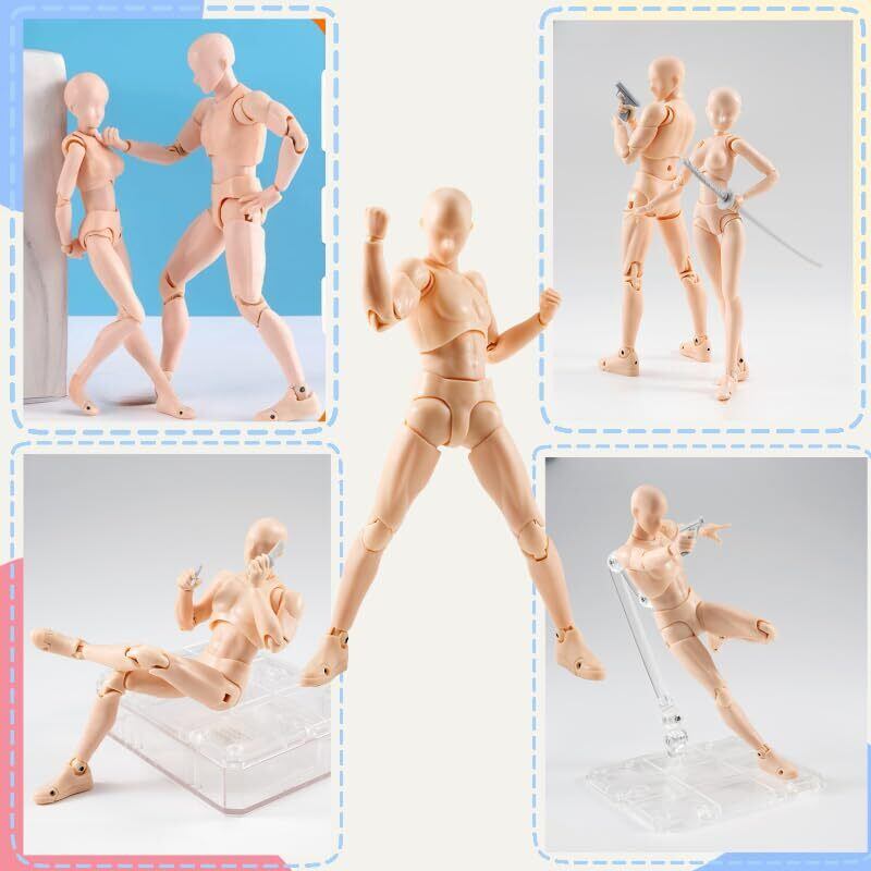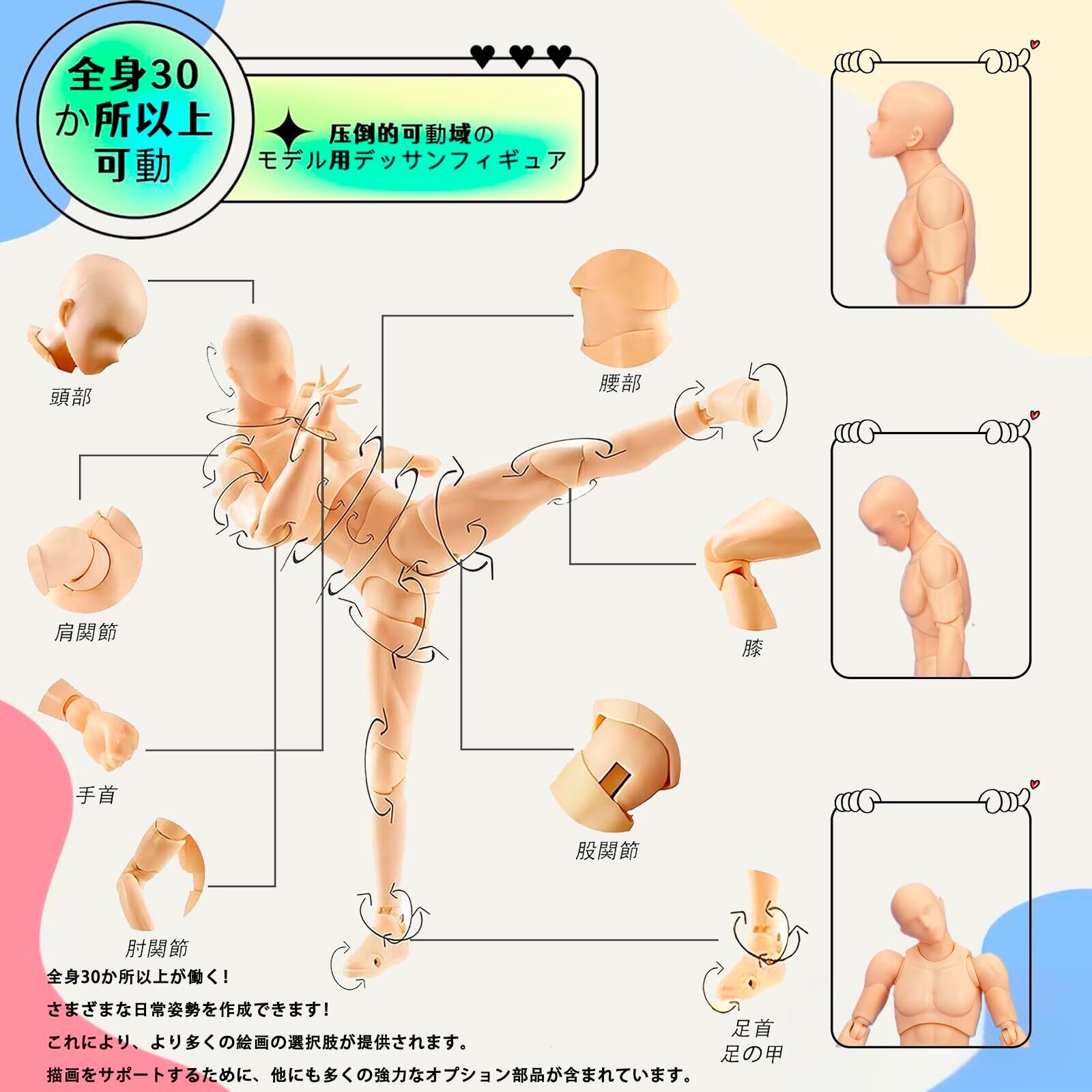 【全身改良版!圧倒的な30可動関節】 「バリの目立ち」「関節の緩さ」「パーツ交換の難しさ」「可動の硬さ」といったお声に応え、改良を重ねました!!全身30ヶ所以上の関節にこだわり、あらゆるポーズを再現。あなたの思い通りにポーズを決められ、あらゆる角度からの観察とデッサンを可能にします。男性モデル:全長約14cm、女性モデル:全長約13cm。対象年齢:15歳以上