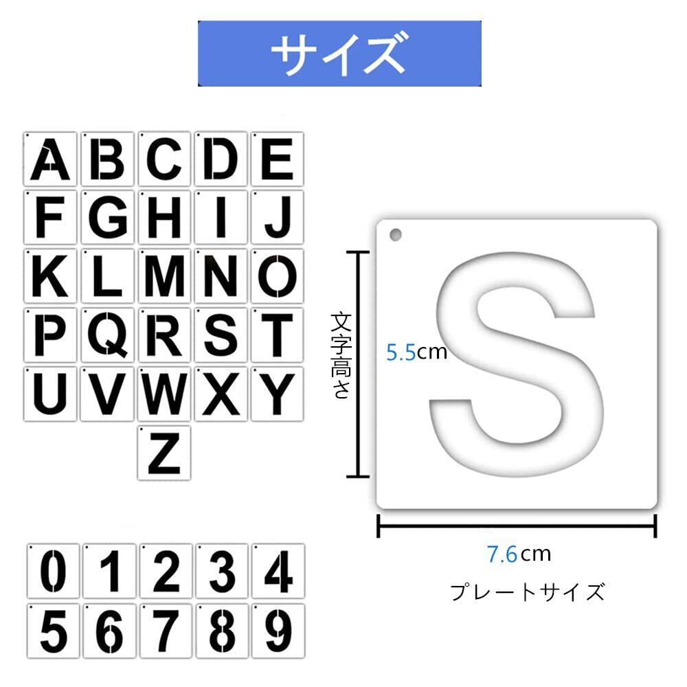 1.【セット内容】ステンシルシート36枚セット、シートサイズ:7.6×7.6cm、 文字サイズ:約5.5cmです。