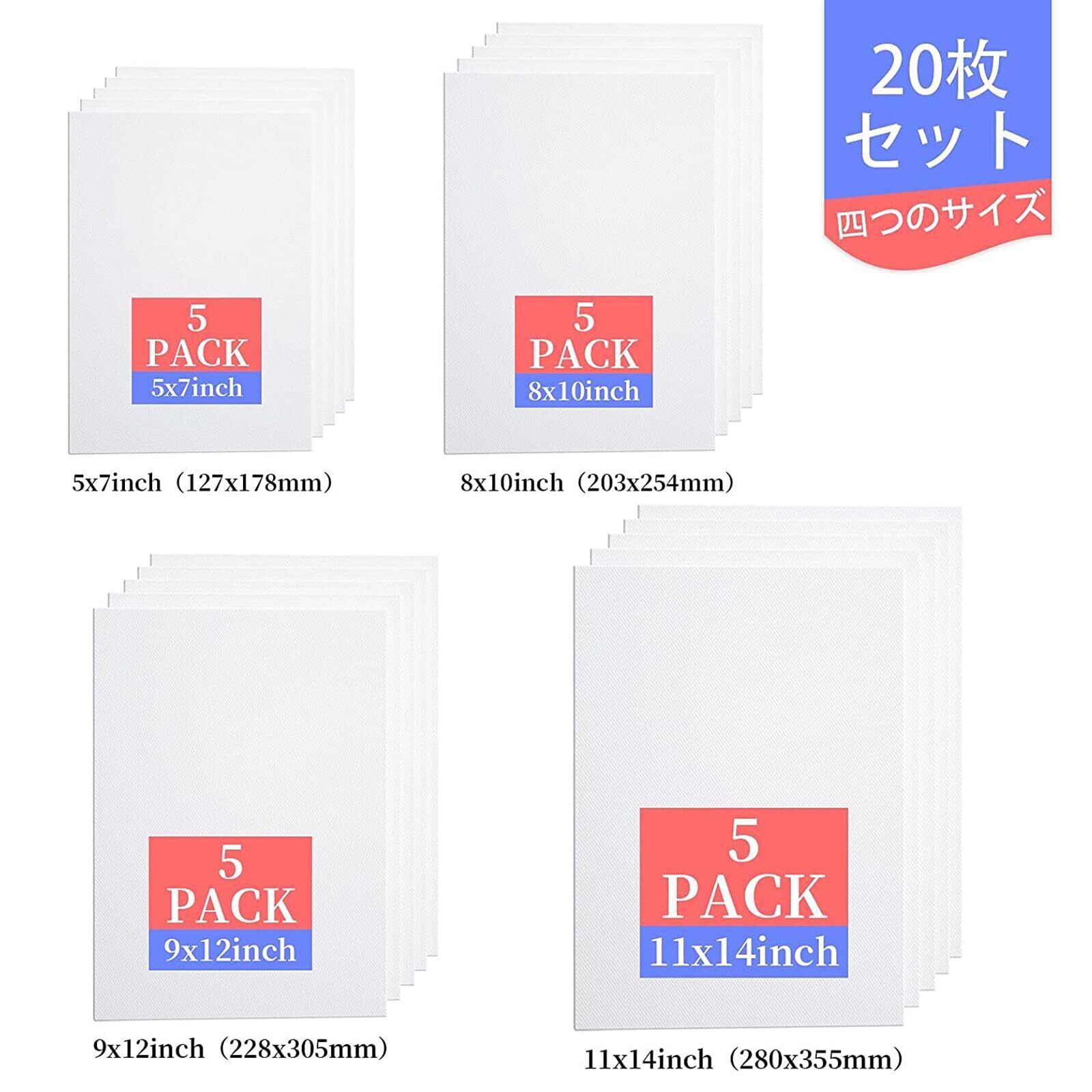 【四つのサイズ】豊かな20枚セットで、(127×178、203×254mm、228×305mm、280×355mm)の四つのサイズがあり、各サイズに5枚があります。サイズは豊富なので、ニーズに合わせてお選びいただけます。想像力をフルに発揮できます。子供、大人、高齢者、初心者だけではなく、絵画の練習を目的としたアーティストや専門家に最適です。油絵画、アクリル画、水彩画、水粉画、テンペラなど、多くのタイプの絵画に適しています。