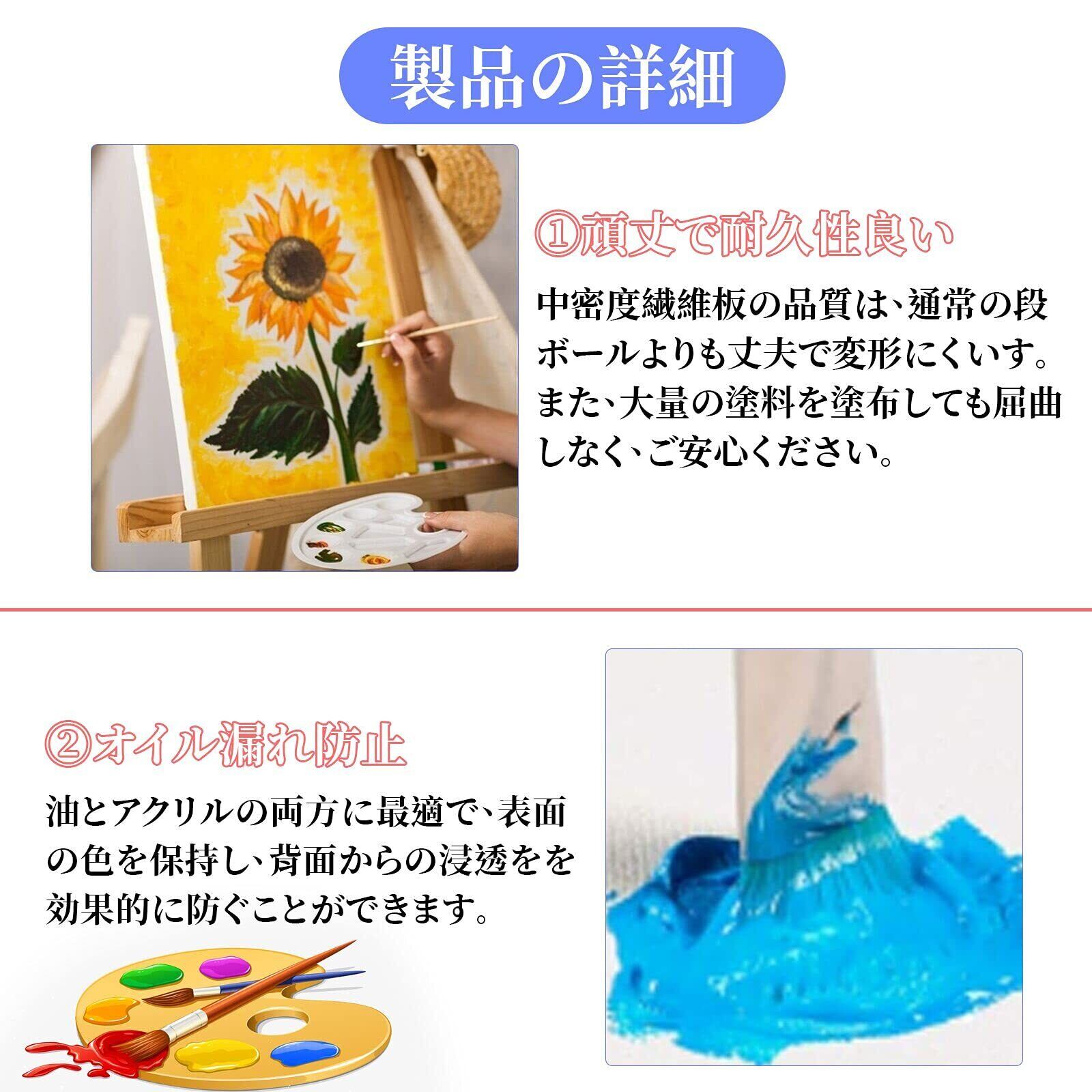 【綿化繊混紡&高品質ボード】綿化繊混紡は麻に比べてキャンバスの目が均一で描きやすく、滑らかな手触りを持ち、色乗りがよくになります。また、褪色しにくい、長期間鮮やかな色を保ちます。中密度繊維板の品質は、通常の段ボールよりも丈夫で変形にくいす。また、大量の塗料を塗布しても屈曲しなく、ご安心ください。