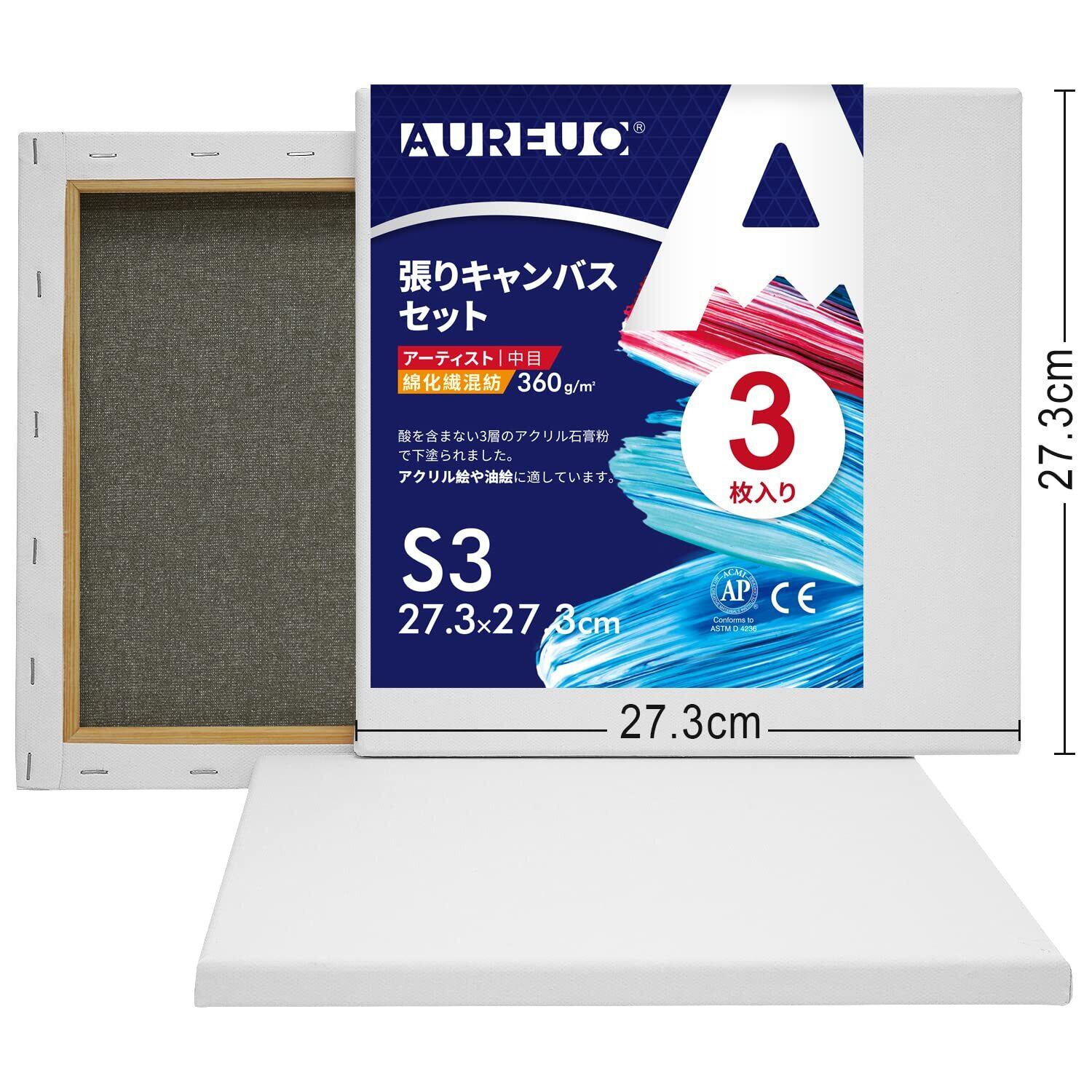 【人気商品】AUREUO 綿化繊混紡 張りキャンバス S3 (27.3cmX27.3cm) 3枚 - 中目布纹 水彩画・油絵画・アクリル兼用 - モダンアート・ポップアートに最適