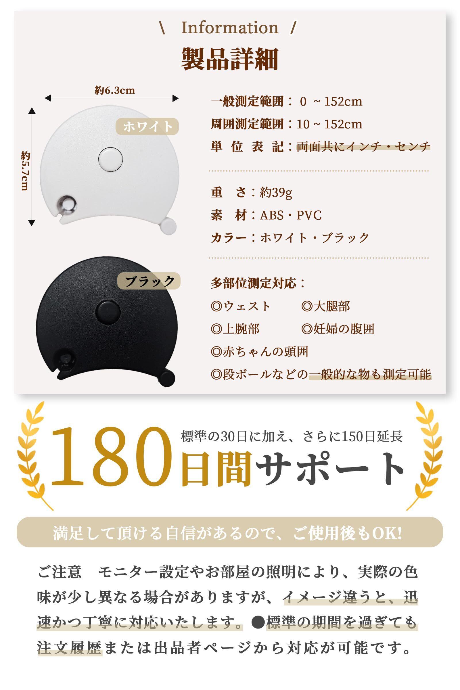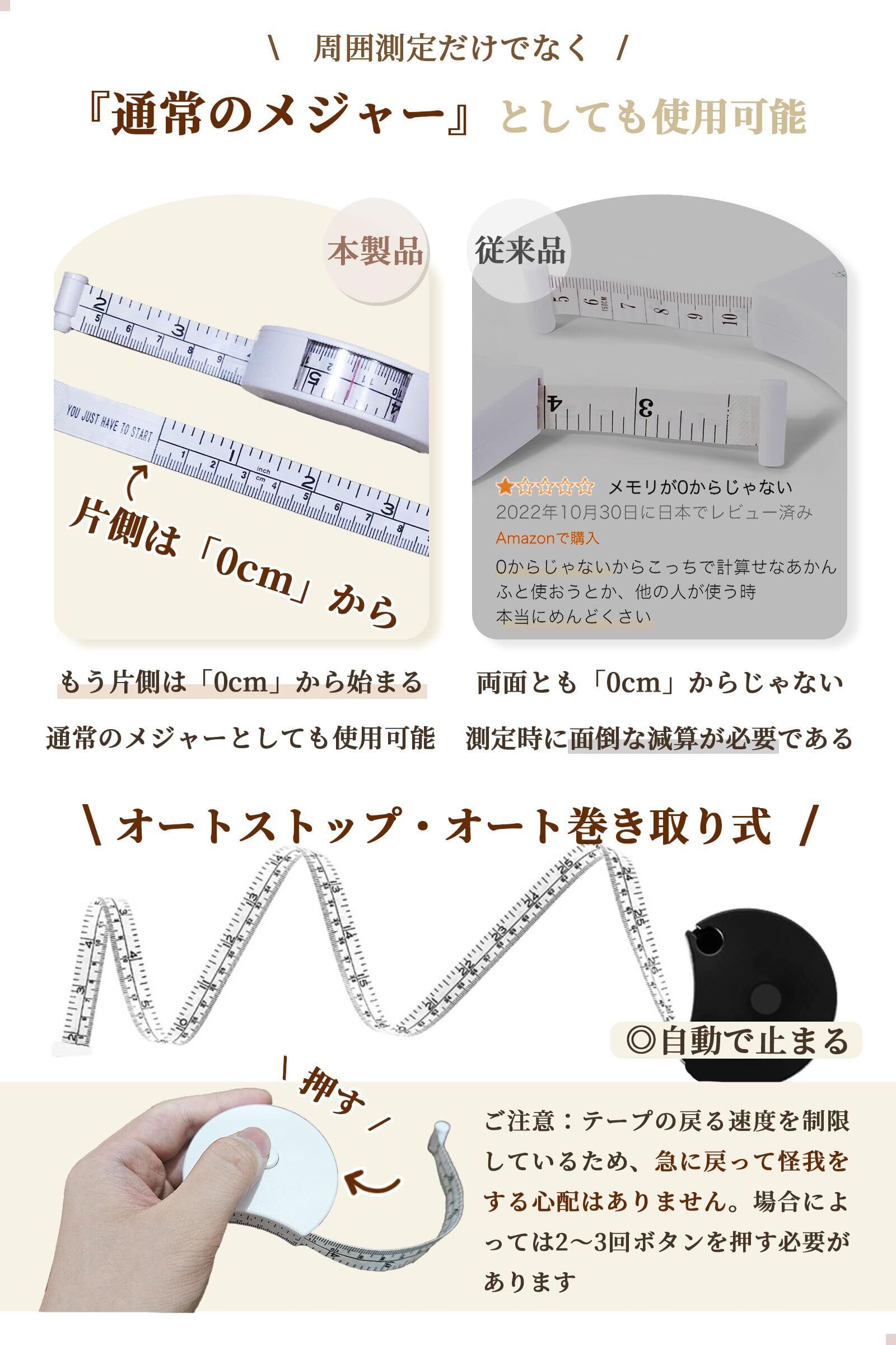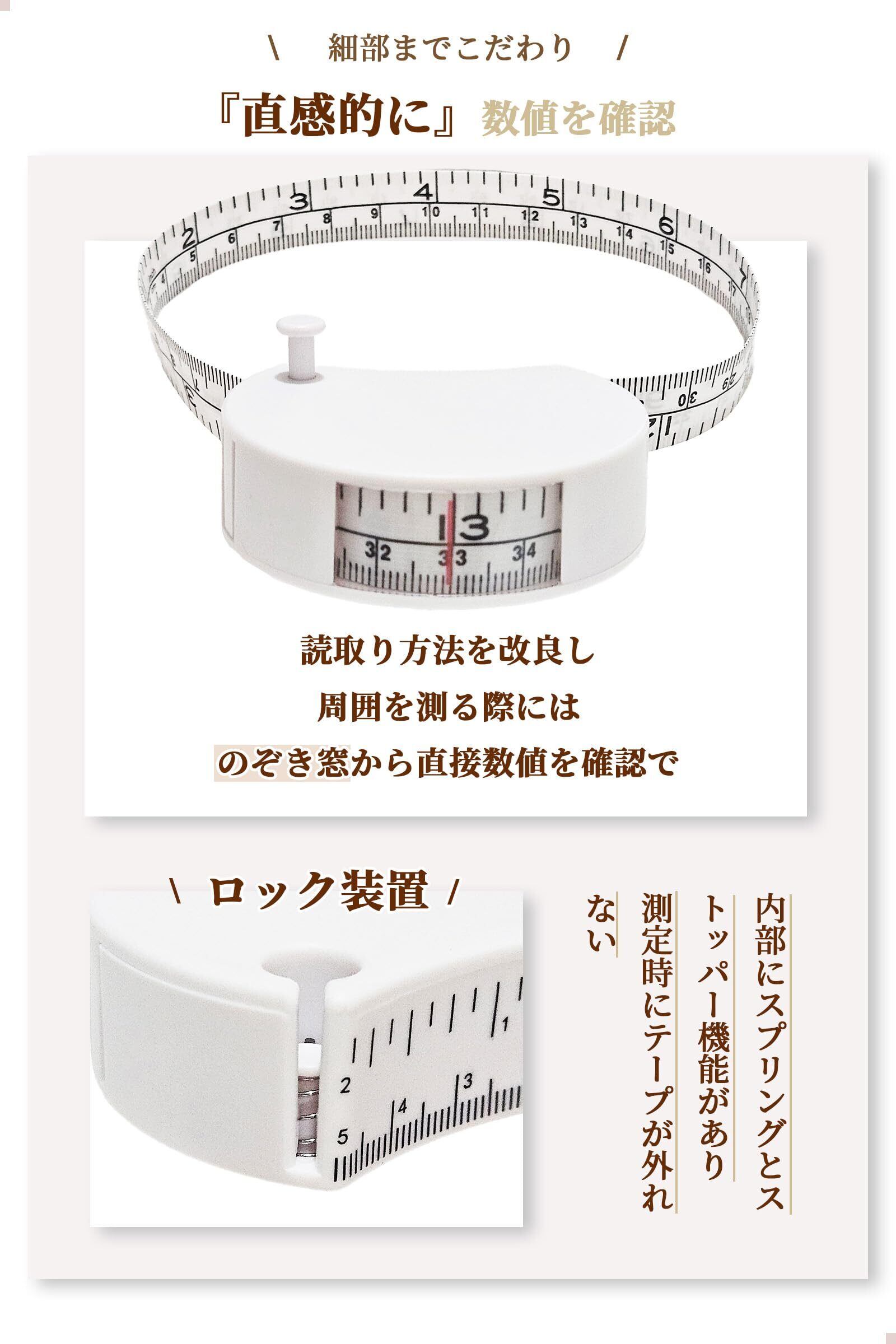【簡単な操作ステップ】STEP1: テープを測定物に巻き、テープの端を穴に挿入します。STEP2: ボタンを押して、テープを収縮させて、数値はのぞき窓に表示されます。【ご注意】テープの戻る速度を制限しているため、急に戻って怪我をする心配はありません。場合によっては2〜3回ボタンを押す必要があります