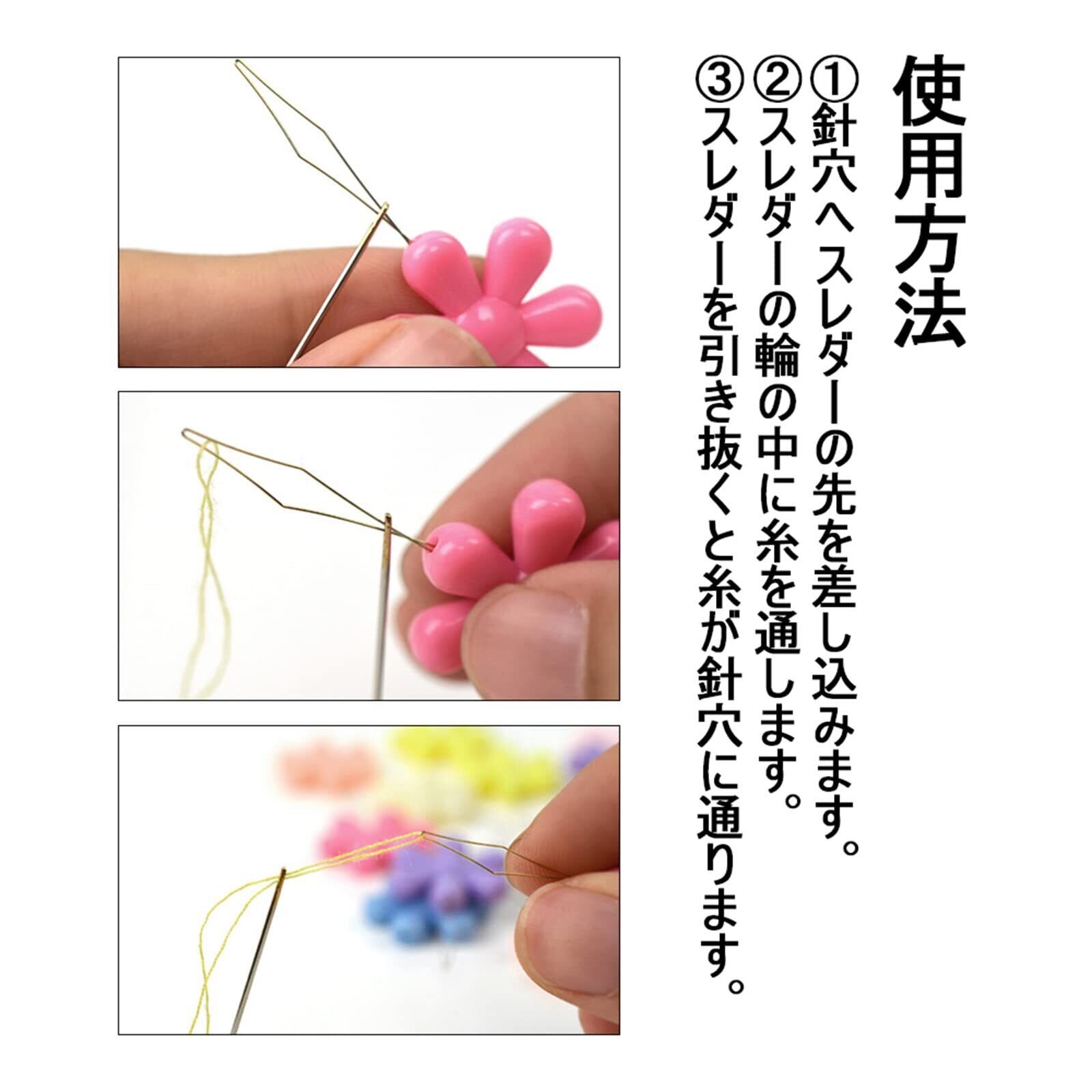 使用方法:①針穴へ糸通しの先を差し込みます。②糸通しの輪の中に糸を通します。③糸通しを引き抜くと糸が針穴に通ります。