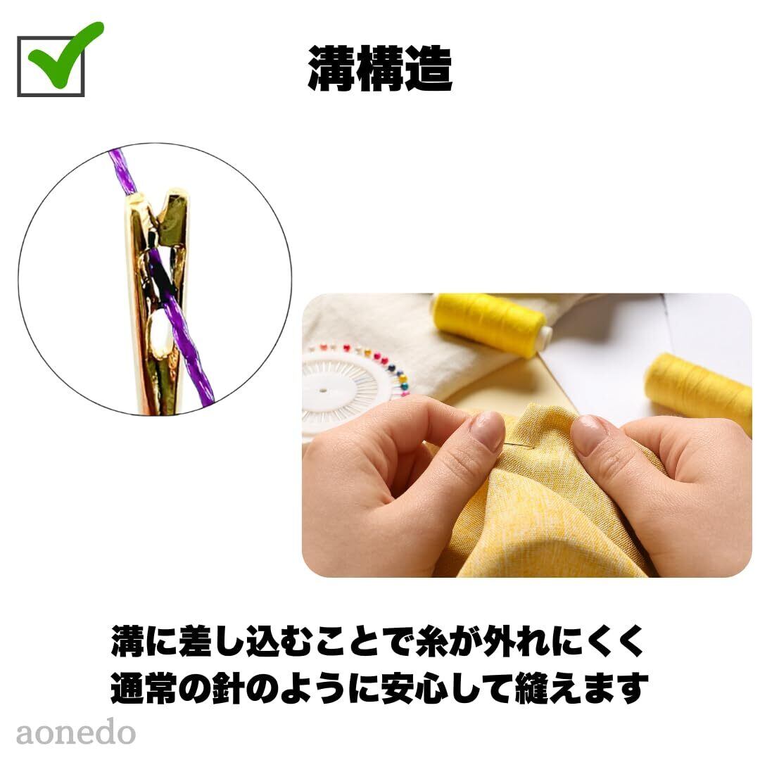 【溝構造】糸を針穴に通さず、上部のミゾに差し込むだけで簡単にセットできます。糸が外れにくい構造になっているので、縫い進めても簡単に抜けることはありません。通常の針と同じように安心してお使いいただけます。