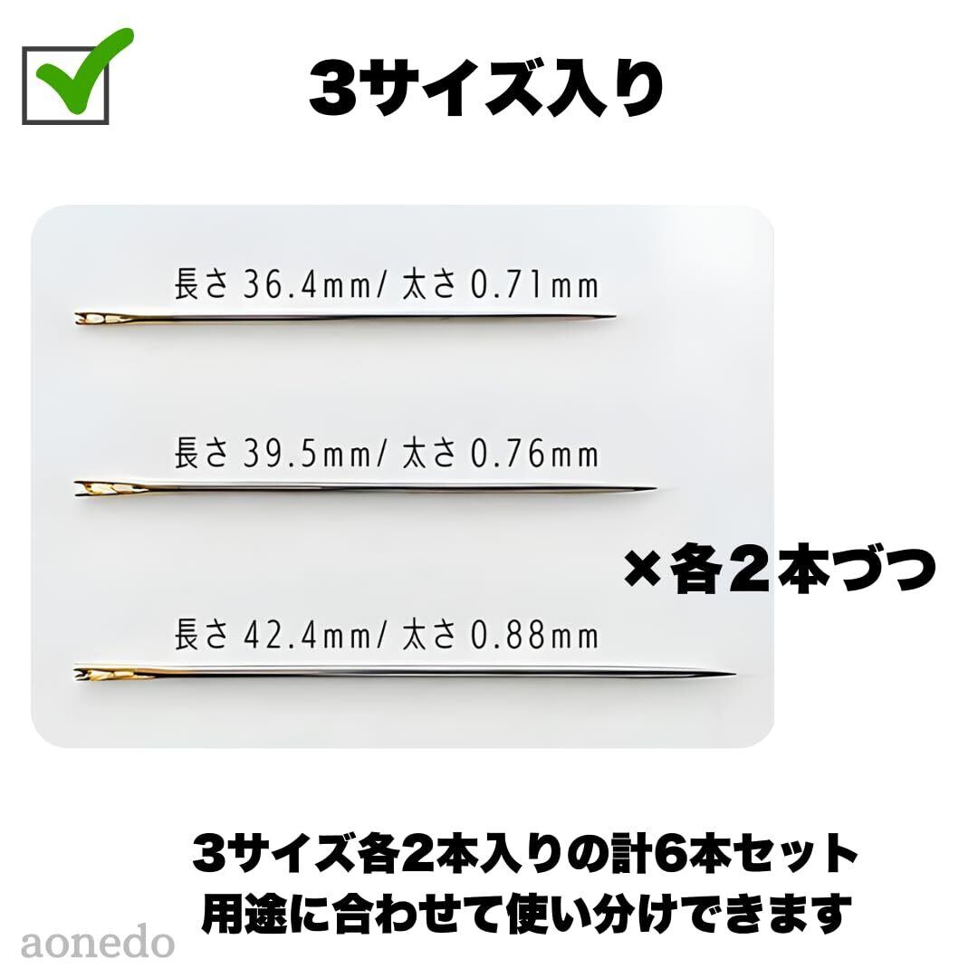 【3サイズ入り】長さ42.4mm(太さ0.88mm)×2本、39.5mm(0.76mm)×2本、36.4mm(0.71mm)×2本の計6本セット。サイズ違いで用途に合わせて使い分けでき、さまざまな布地や作品作りに対応できます。予備としても安心です。