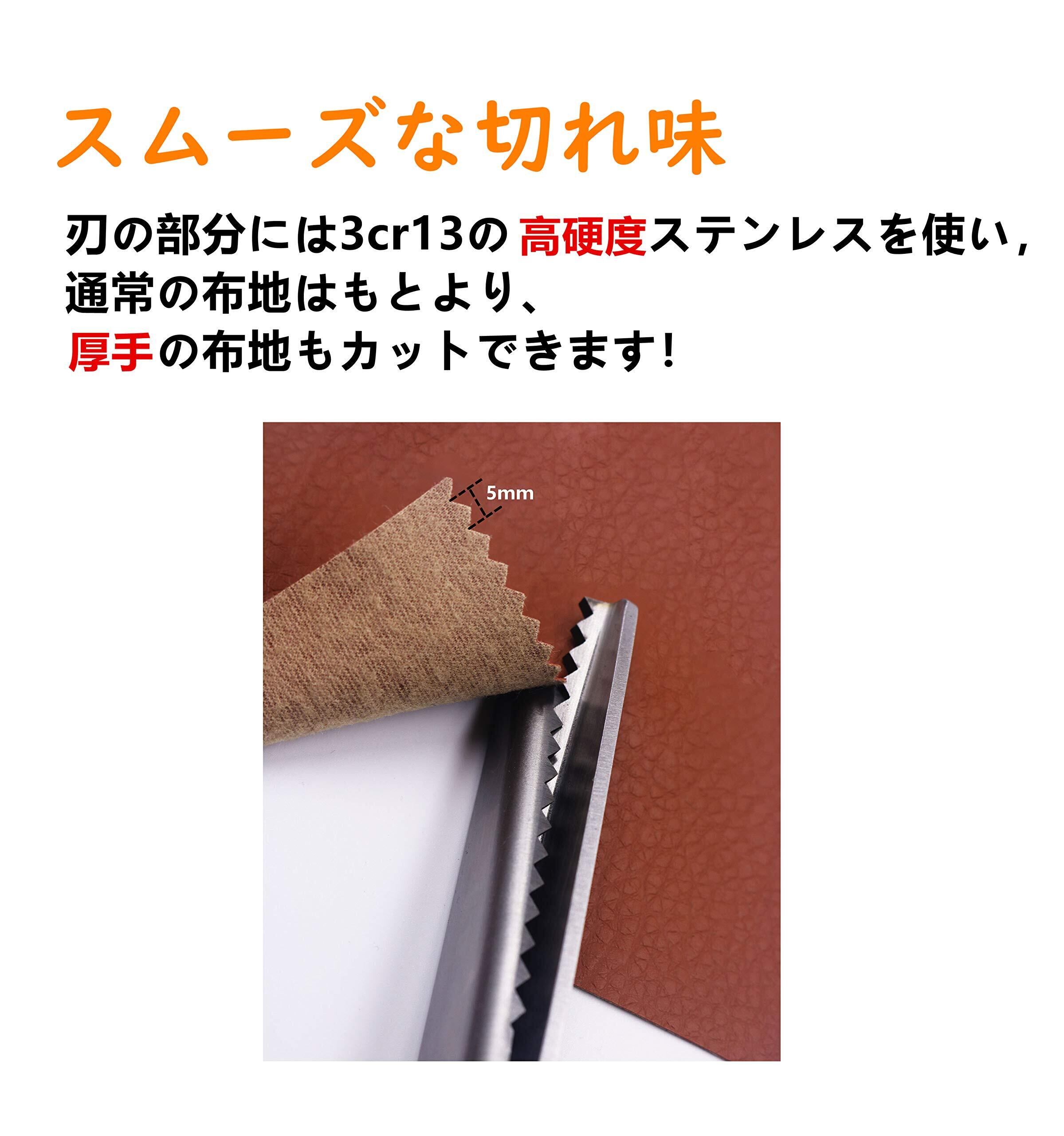 【用途】絹・綿からナイロン、革、ニット、反物まで、多種多様な布地にご利用いただけます。ビニール袋やコットンペーパーのカットにも便利。ギザギザの切り口がほつれ止めに最適です。