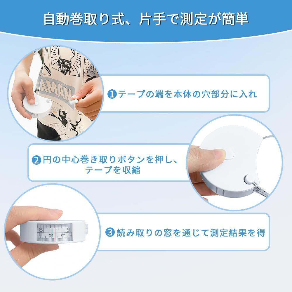 「自動巻取り式、片手で測定が簡単」:メジャーを体に回して、メジャー先端のパーツを窪みにはめ込むだけです、長さの位置を手でとめたりすることもなく簡単に計測できます。測定完了したらボタンを押すと、巻き尺が自動的に回収されます。巻き取りワンタッチ、片手操作が可能になり、1人でも体のサイズを測れるメジャー。