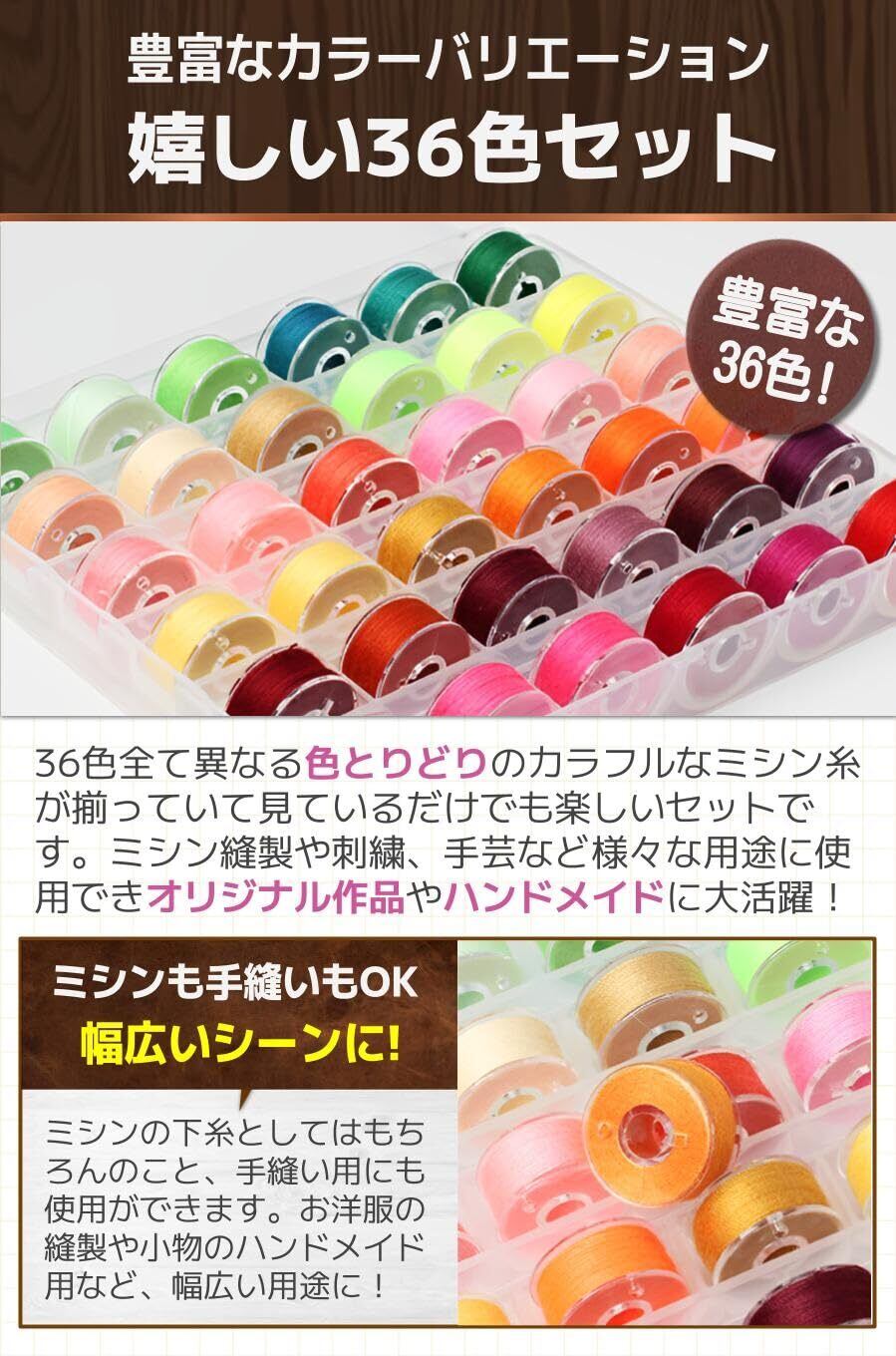 【嬉しい36色セット】36色全て異なる色とりどりのカラフルなミシン糸が揃っていて見ているだけでも楽しいセットです。ミシン縫製や刺繍、手芸など様々な用途に使用できオリジナル作品やハンドメイドに大活躍!