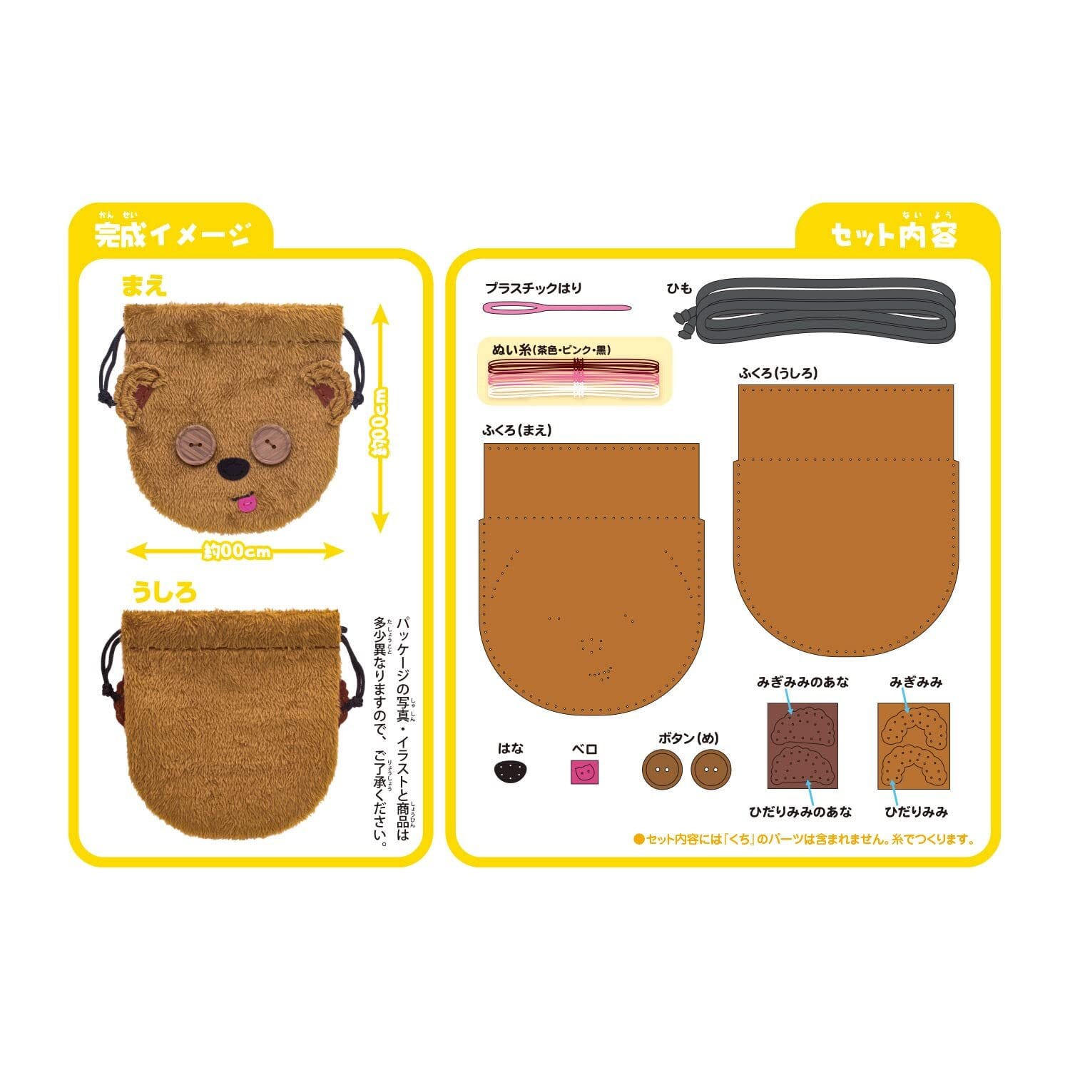 キット内容:綿、フェルト、プラスチック針、糸素材:布、糸:ポリエステル/ひも:PP/タグ:PU/縫い針:ABS