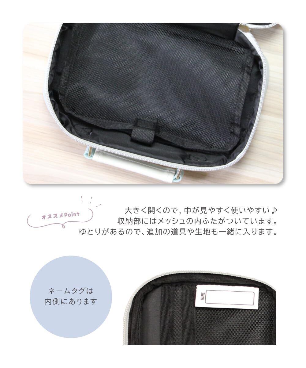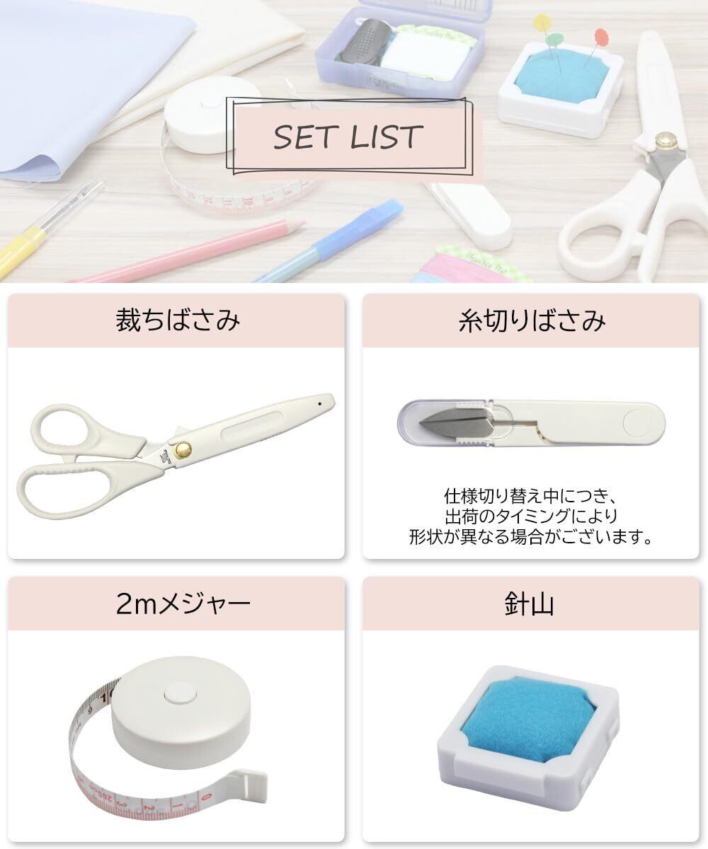 【セット内容】・裁縫バッグ ・針セット(折れ針入れ付き) なが針×2、中針×1、ししゅう針×1、みじか針×2、ミシン針×1、マチ針×10 名前シール×1、指ぬき2種、糸通し×1、ひも通し×1 手縫い糸(白25m、赤・黒・ピンク・ブルー各約12.5m) ・針山 ・リッパー ・メジャー2m ・日本製21cm裁ちばさみ(右利き、左利きは商品名をご確認ください) ・糸切りばさみ ・チャコペンシルピンク・ブルー ※はさみの刃の表面についている油は錆止め用です。ティッシュ等で軽く拭き取ってからご使用ください。