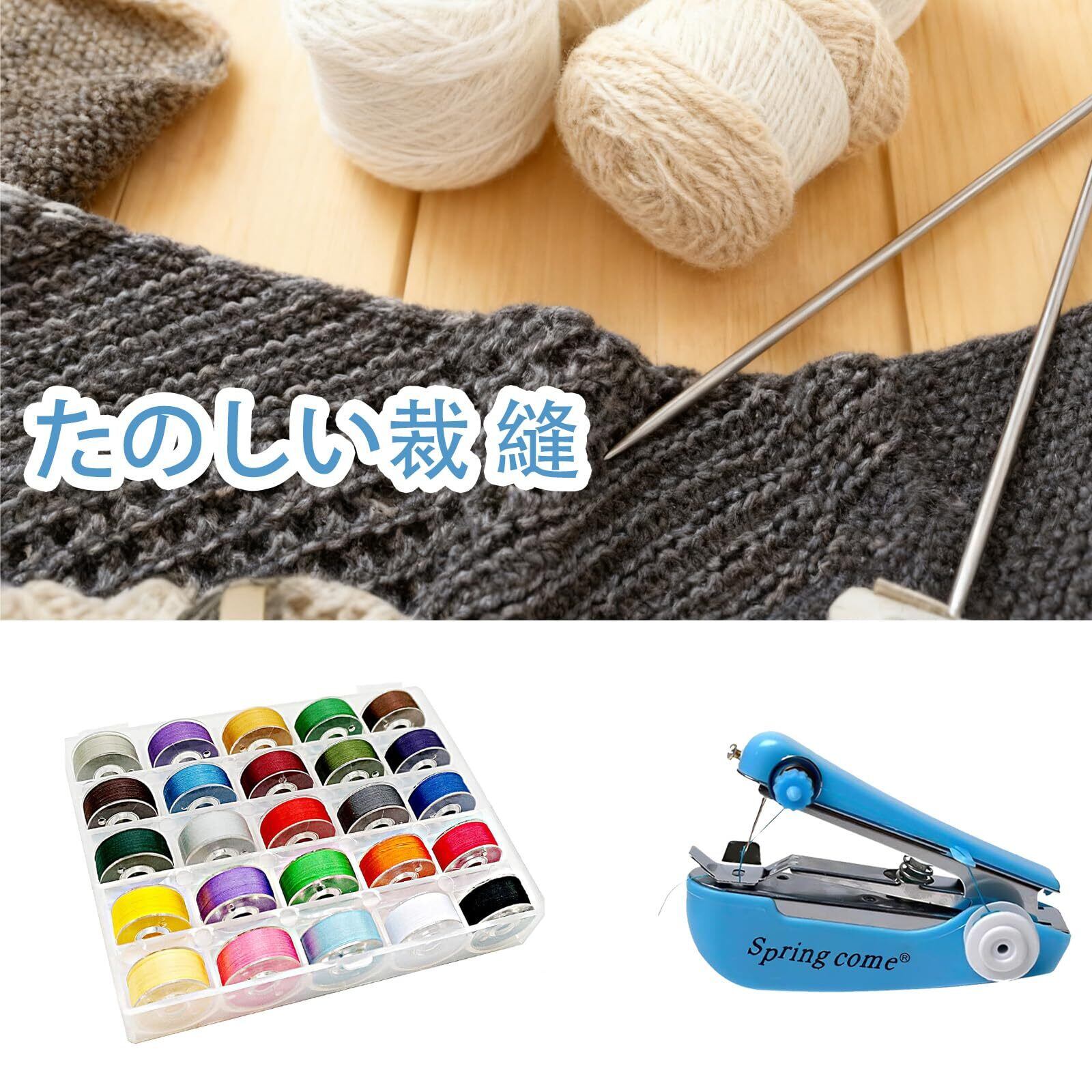 【充実の付属品】ハンドミシン 1台+ ミシン糸ボビンセット 25色+糸用はさみ+自動巻きメジャ一、すぐに使用開始できます。