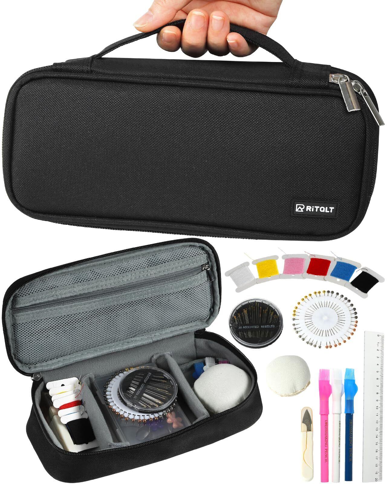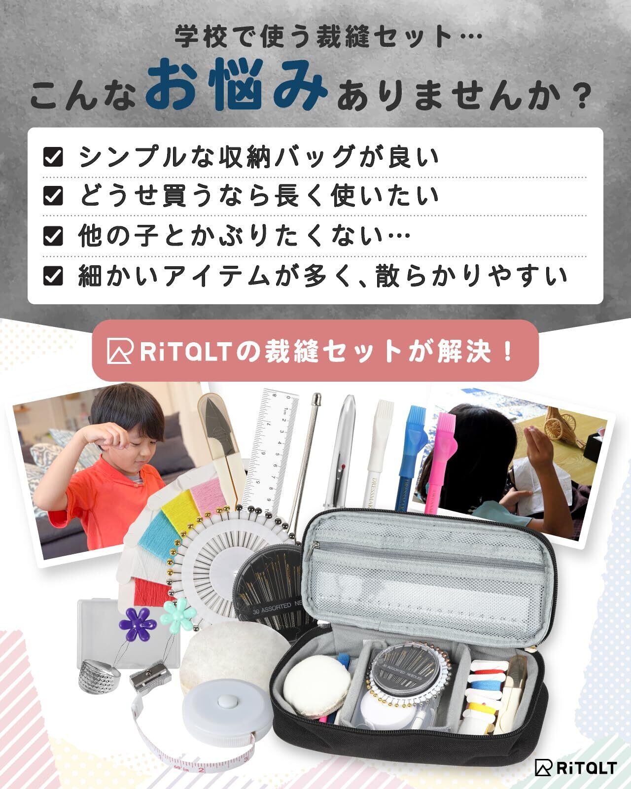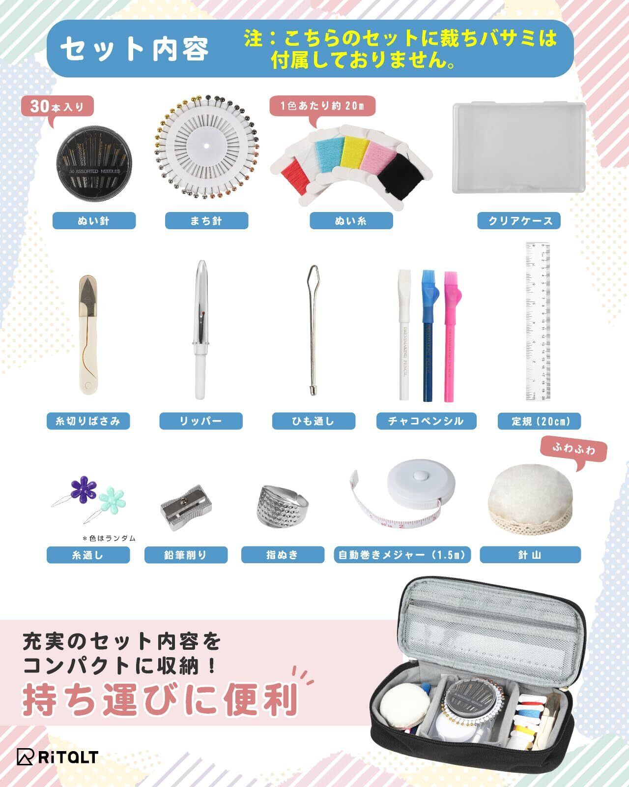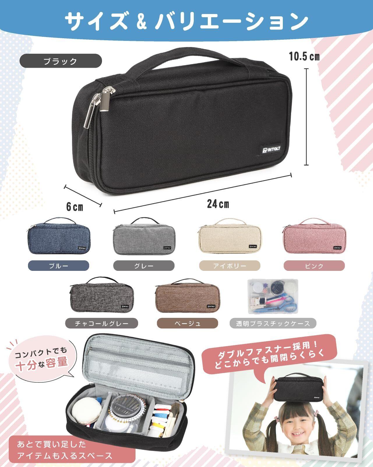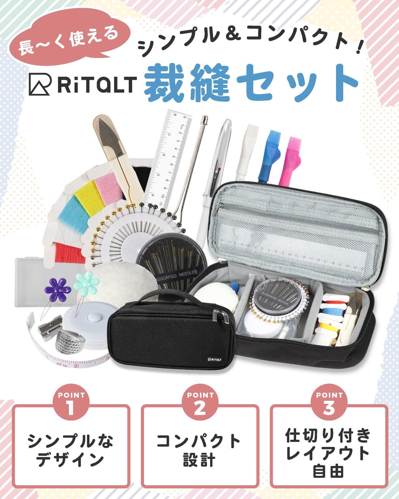 【特価セール】RiTaLT 裁縫セット (裁ちばさみ無し) 小学生 女の子 男の子 小学校 ソーイングセット 大人 裁縫道具 (ブラック)