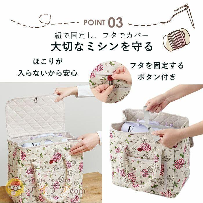 ミシンの収納・持ち運びに便利なコンパクトサイズ。キルト地で丈夫な可愛いバッグ。新聞や雑誌の一時収納も可能。ミシン周りの小道具も収納できるポケット付。製品サイズ:32×21×31cm(持ち手含まず)(幅30×奥行20×高さ30cmのミシンサイズまで対応) 重量:378.2g